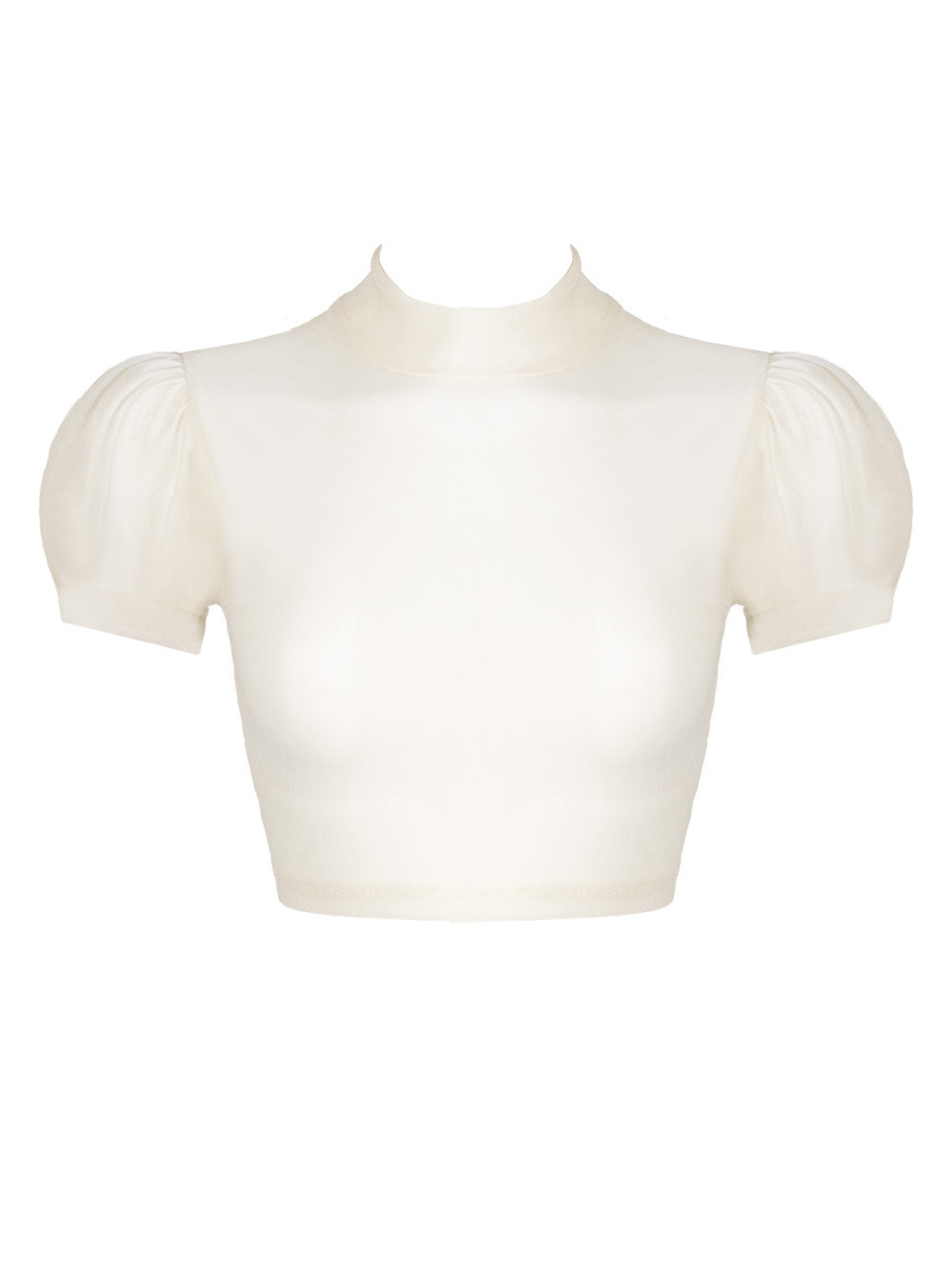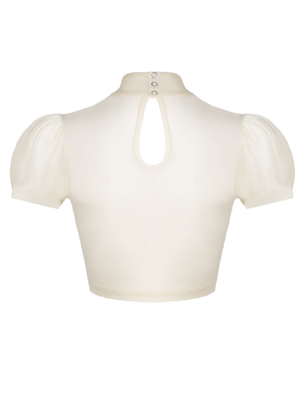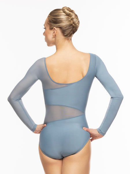 The model is wearing a leotard, crop top, and skirt in adult size M.