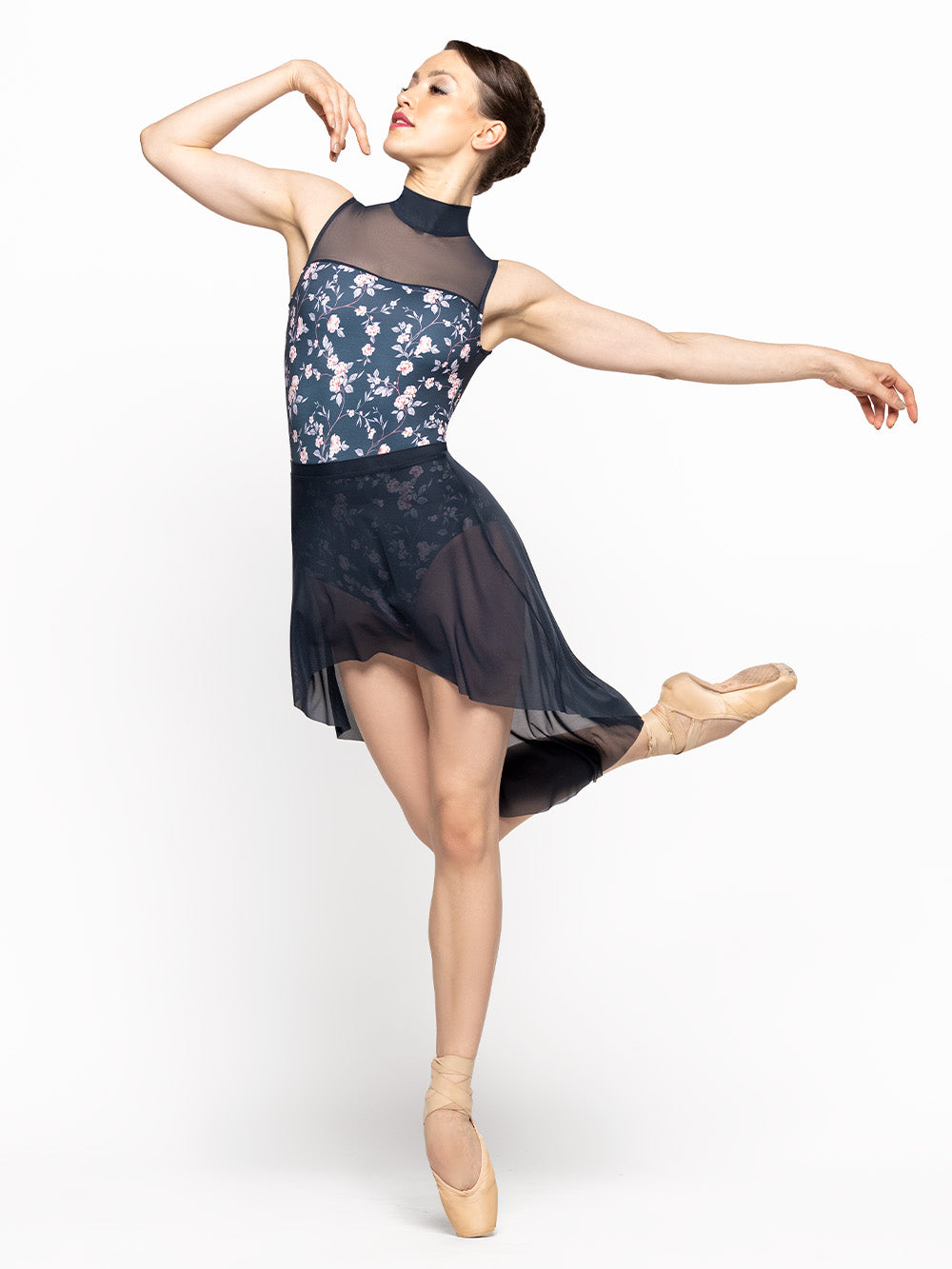 Model is wearing Elizabeth Leotard Flourish Storm Kids RTW in size Adult Medium with a Dramatic High-Low Skirt Kids in Dark Storm Mesh.