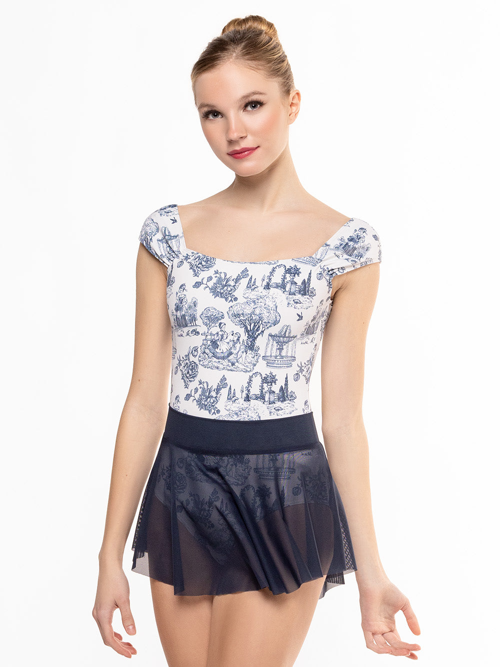 Model is wearing Hipster Skirt Dark Storm Mesh Kids RTW in size Adult X-Small with Angelina Leotard Toile Kids RTW.