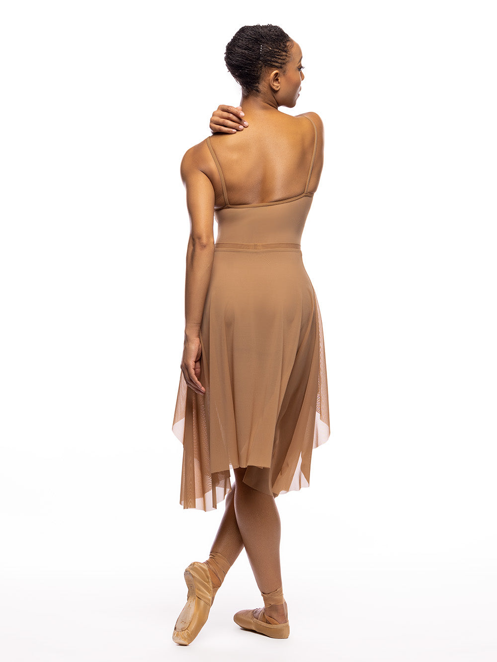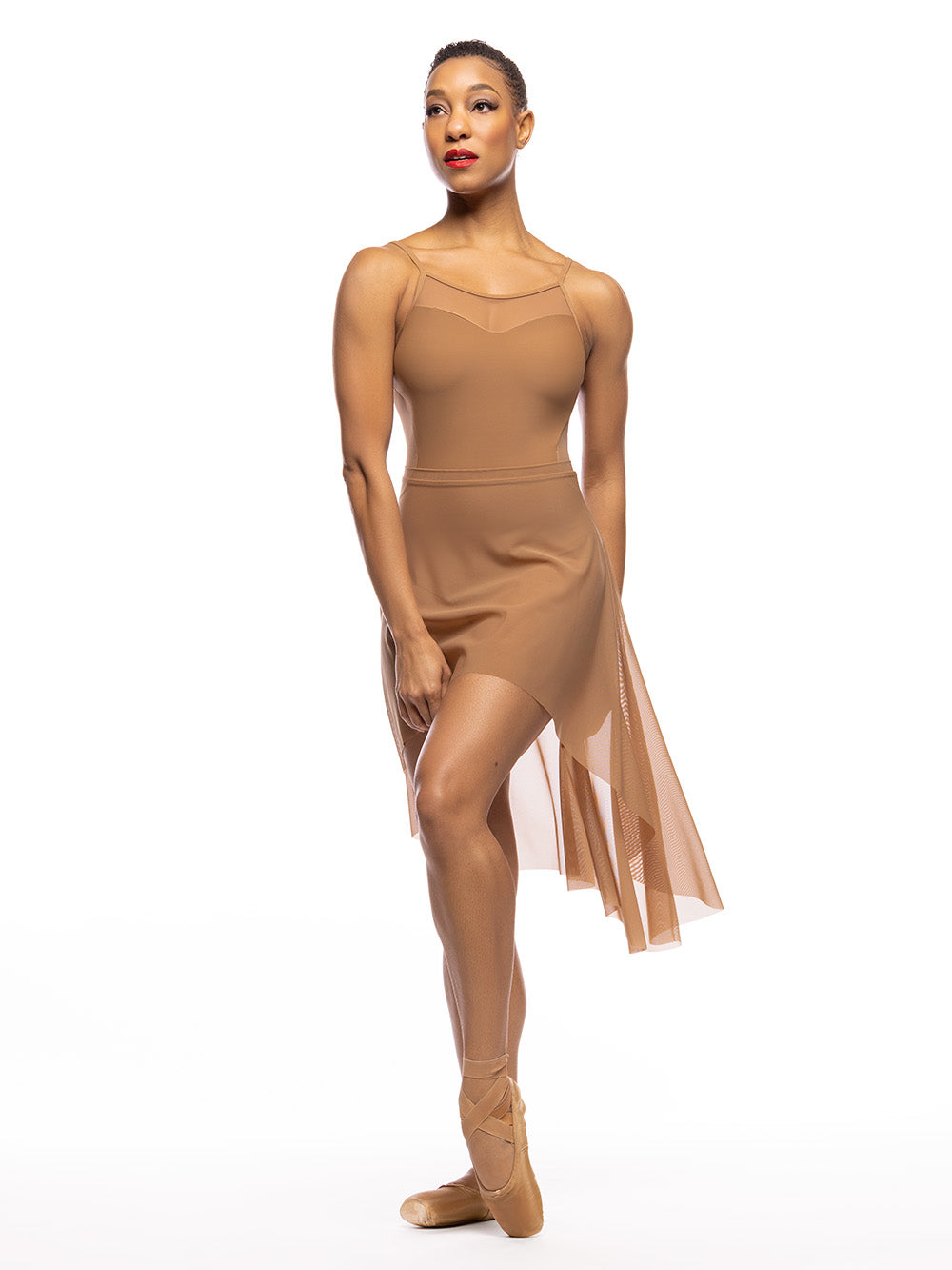 Model 1 is wearing Maddie Caramel Leotard RTW in size Adult Small with Short Dragonfly Skirt Caramel Mesh RTW.