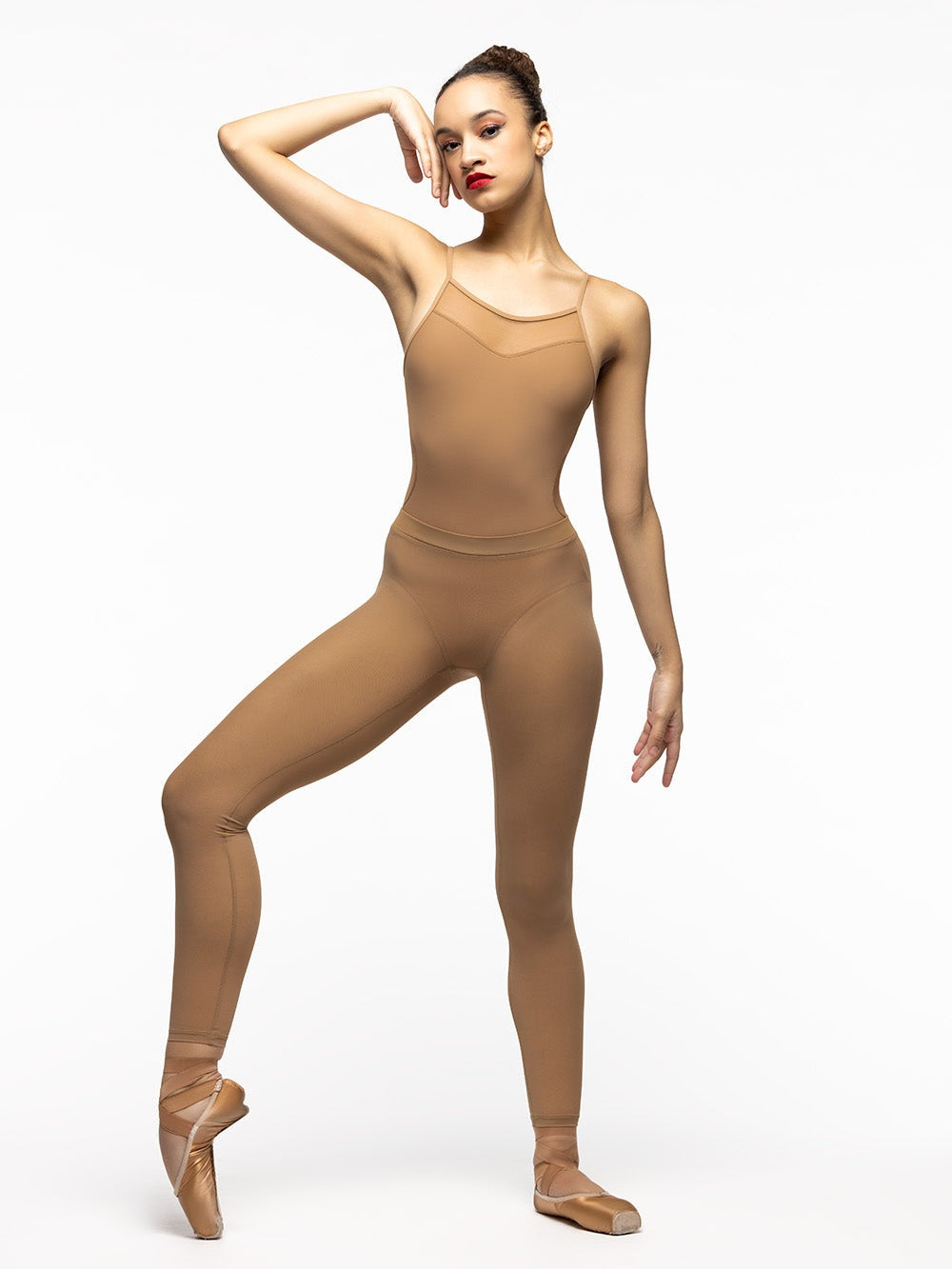 The Maddie leotard in Caramel features cami straps, a peekaboo sweetheart mesh panel, and flattering wrap around back panel in Caramel Mesh for a monochrome performance look!
