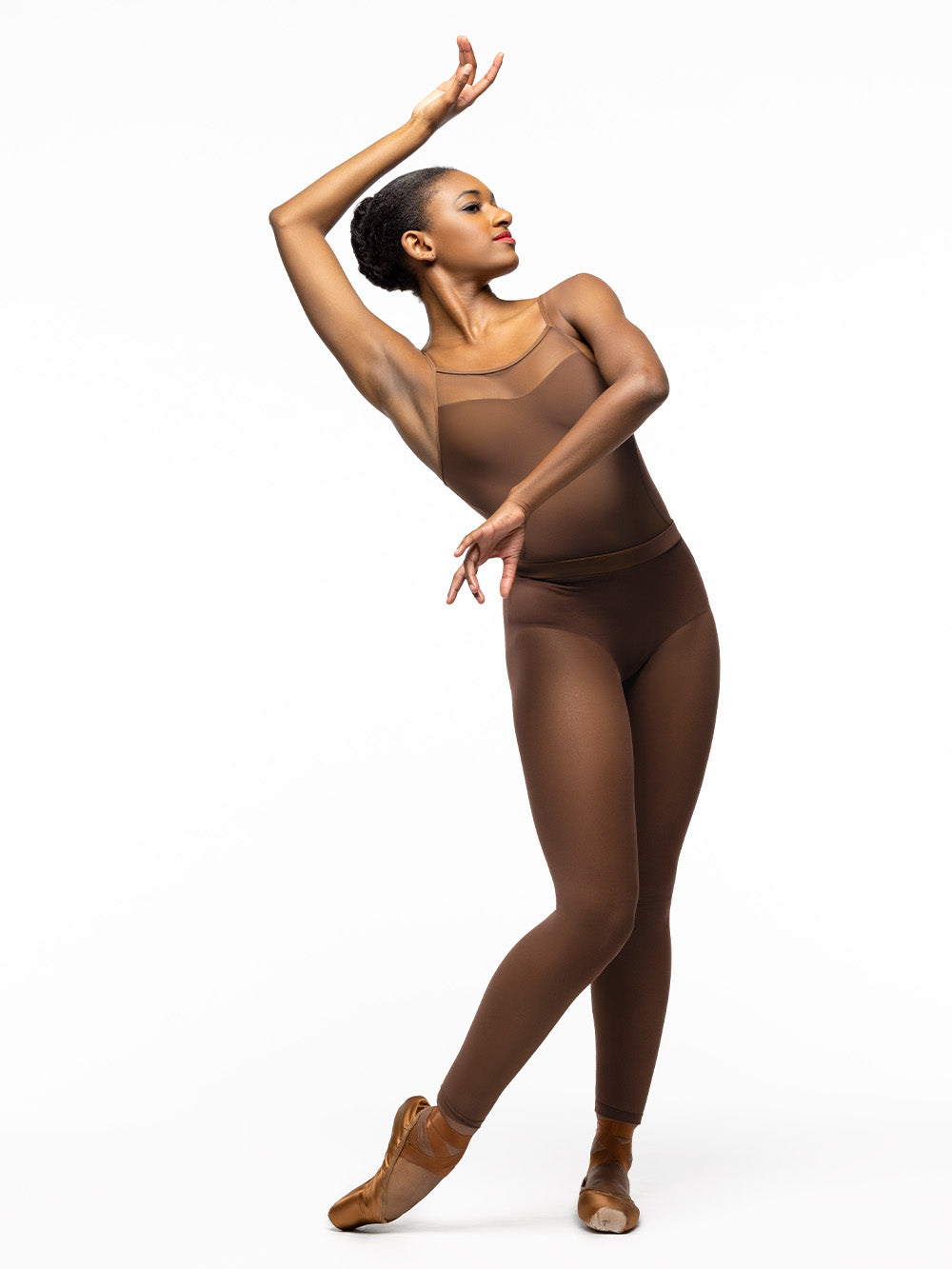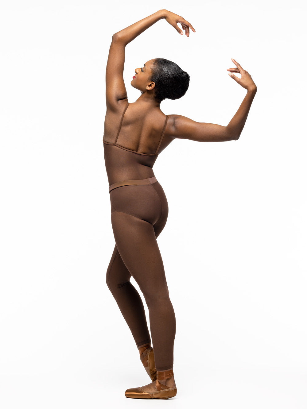 Model 2 is wearing Maddie Coffee Leotard RTW in size Adult Medium with Kira Tights Coffee Mesh RTW.