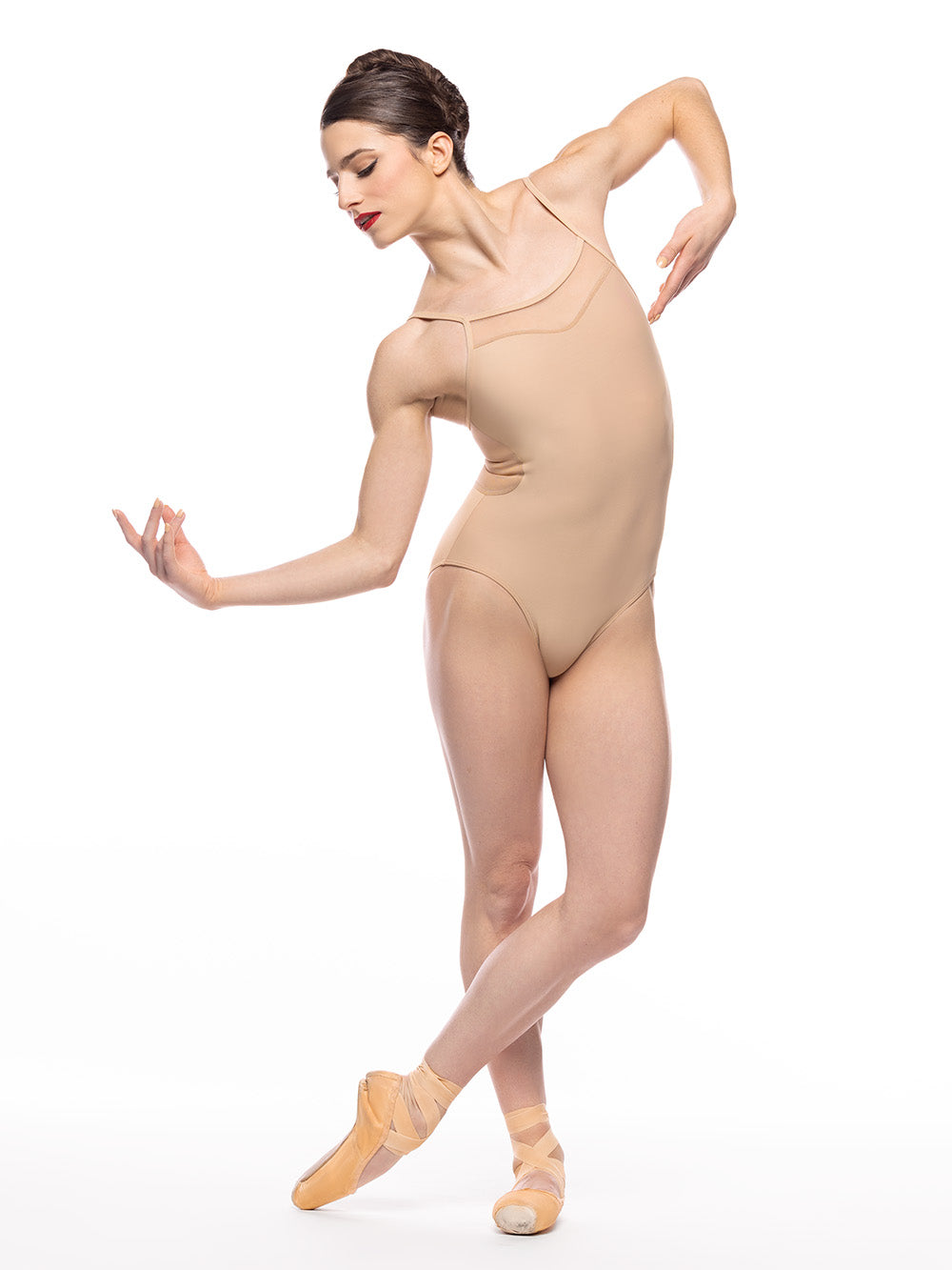 The Maddie leotard in Tan features cami straps, a peekaboo sweetheart mesh panel, and flattering wrap around back panel in Tan Mesh for a monochrome performance look!