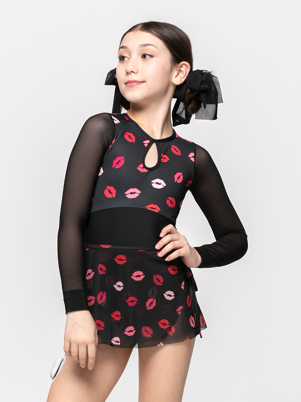 Lips like Sugar.... Sugar Kisses.... Our Rendina Leotard features our all over Kisses print, a Black Soft base, and Mesh sleeves to the wrist. Complete the look with our Vienna Short Skirt in the matching mesh.