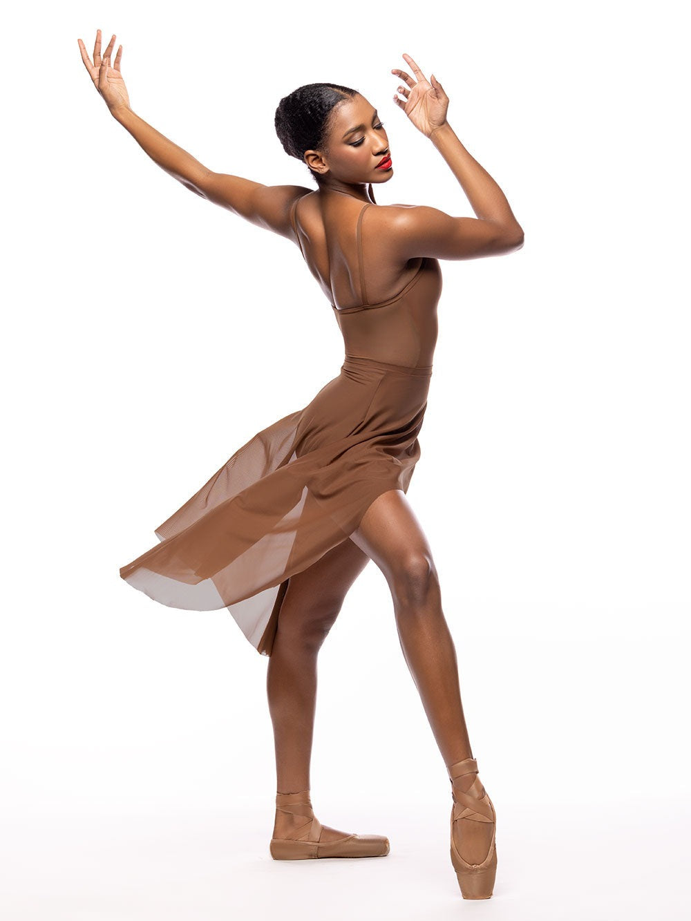 This brilliant skirt style, the Dragonfly, accents any leotard with its divine drape. Now available in Mocha Mesh.