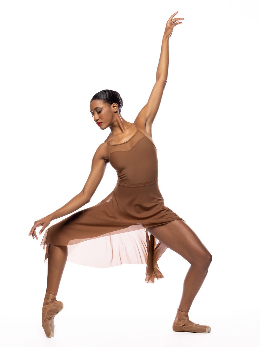 Model is wearing Short Dragonfly Skirt Mocha Mesh RTW in size Adult Medium with Maddie Mocha Leotard RTW.