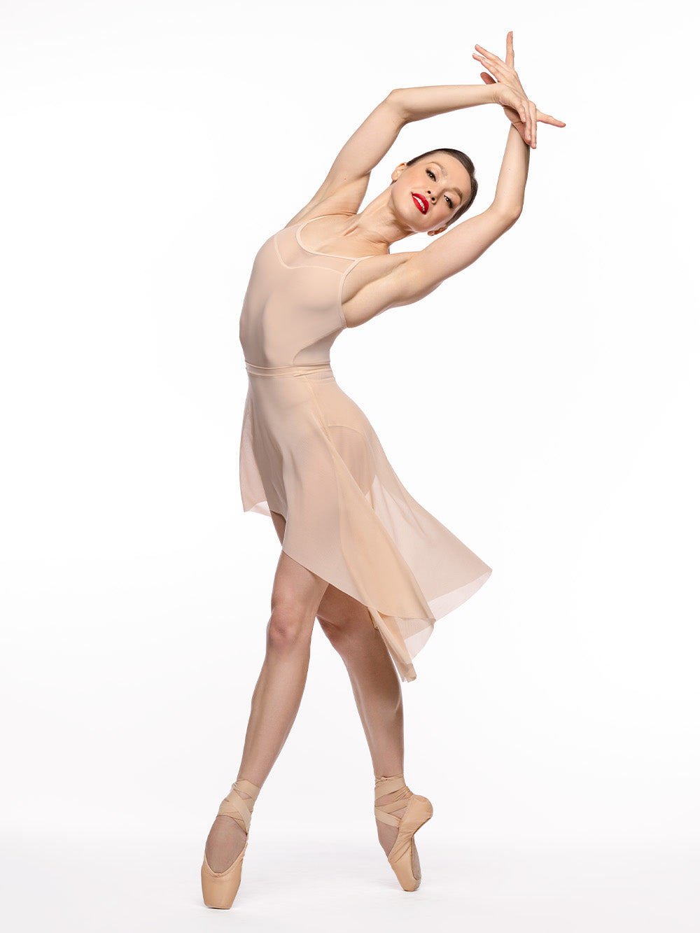 Model is wearing Short Dragonfly Skirt Sand Mesh RTW in size Adult Medium with Maddie Sand Leotard RTW.