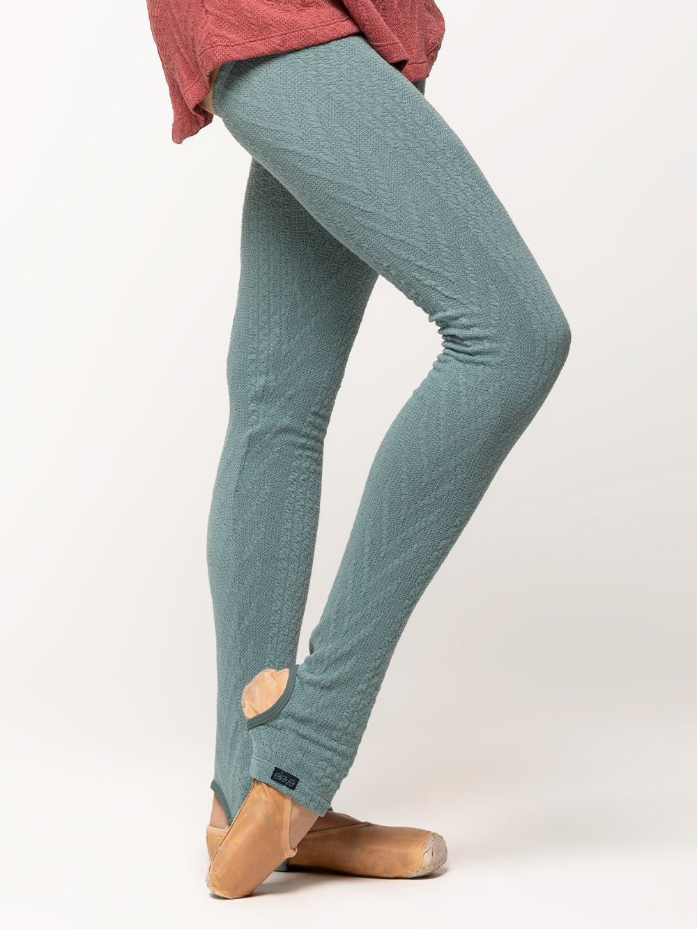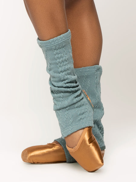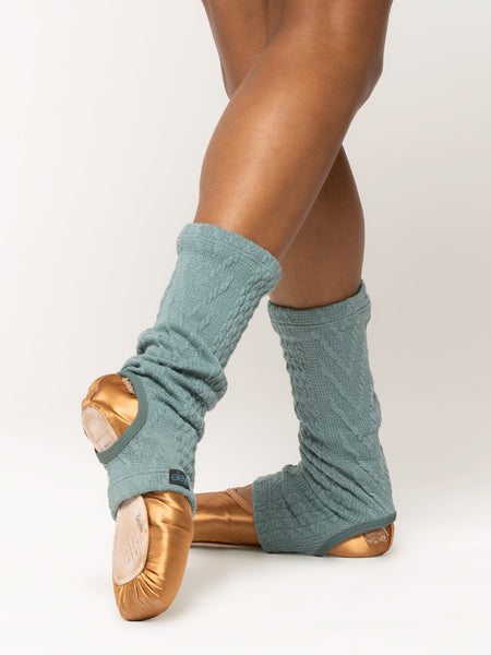 Our cable knit leg warmers in Ocean will warm you from the outside in! These full length leg warmers are perfect for accessorizing or keeping a previous injury healthy. The stirrup line helps accentuate the arch, and the matching trim along the heel keeps it in place.