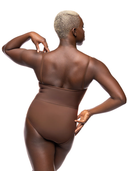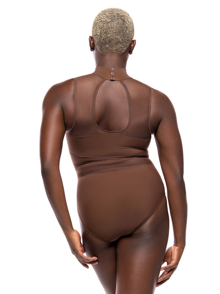 Model is wearing Tulip Skirt Coffee Mesh RTW in size Adult Large with Victoria Coffee Leotard RTW.