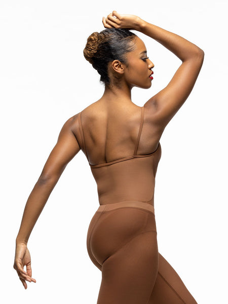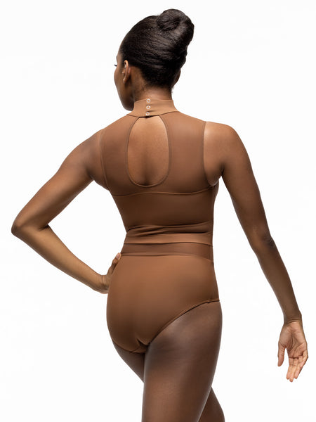 Model is wearing Tulip Skirt Mocha Mesh RTW in size Adult Medium with Victoria Mocha Leotard RTW.