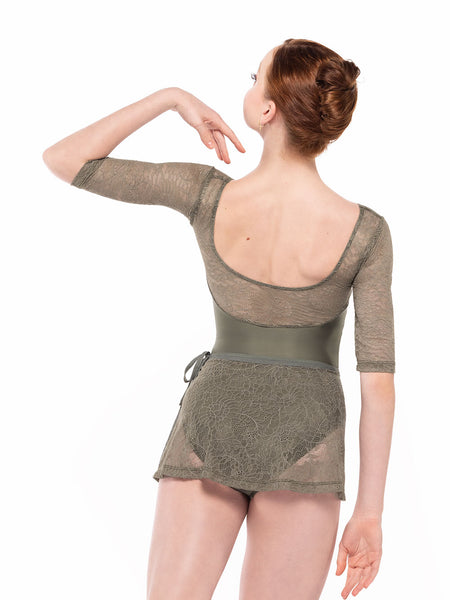 Model is wearing Diana Leotard Dusty Olive Kids RTW in size Child Large with Amora Skirt Dusty Olive Mesh Kids RTW.