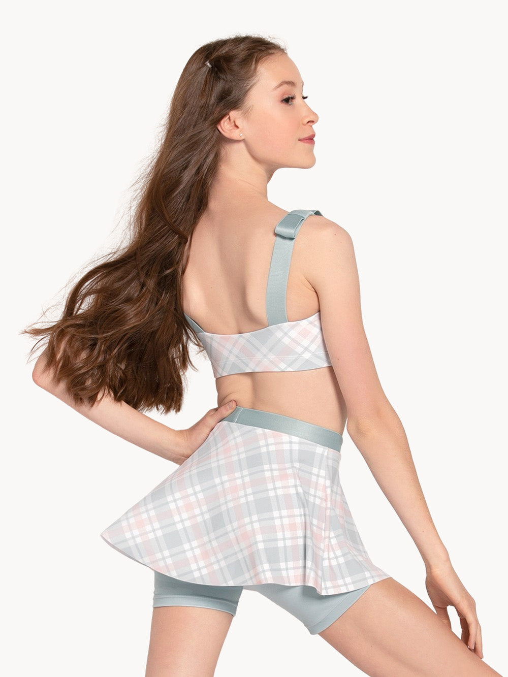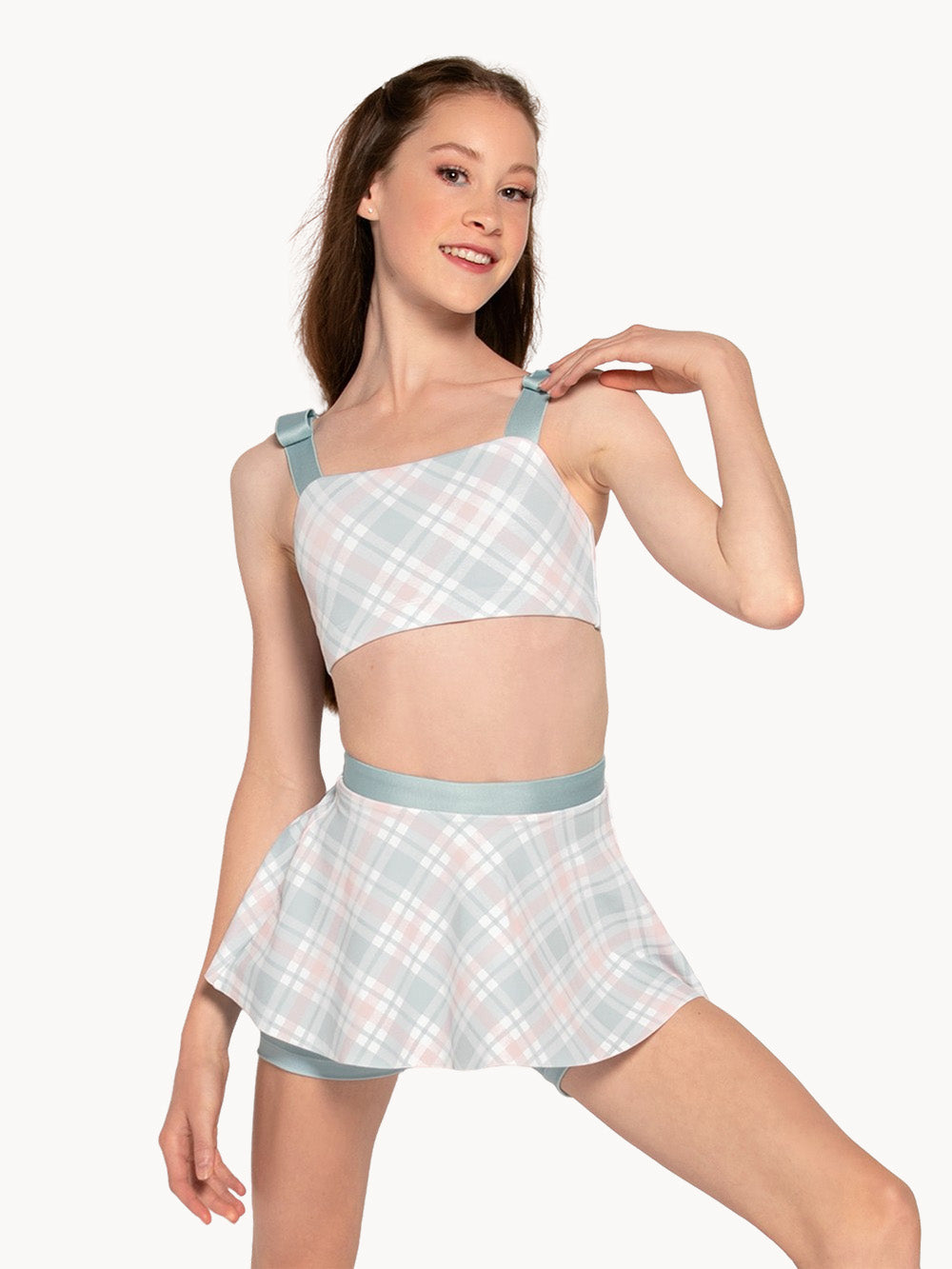 Model 2 is wearing Carolyn Crop Top Pladiness RTW with Flare Skirt Plaidness RTW, Claire Shorts Misty Blue RTW, and Olivia Shorts 7" Plaidness RTW with matching RTW Scrunchie in size CHL.