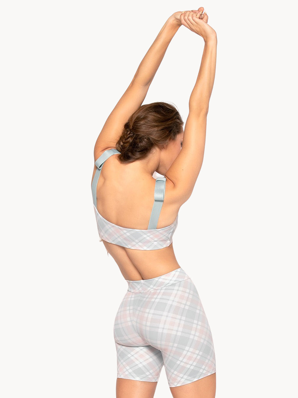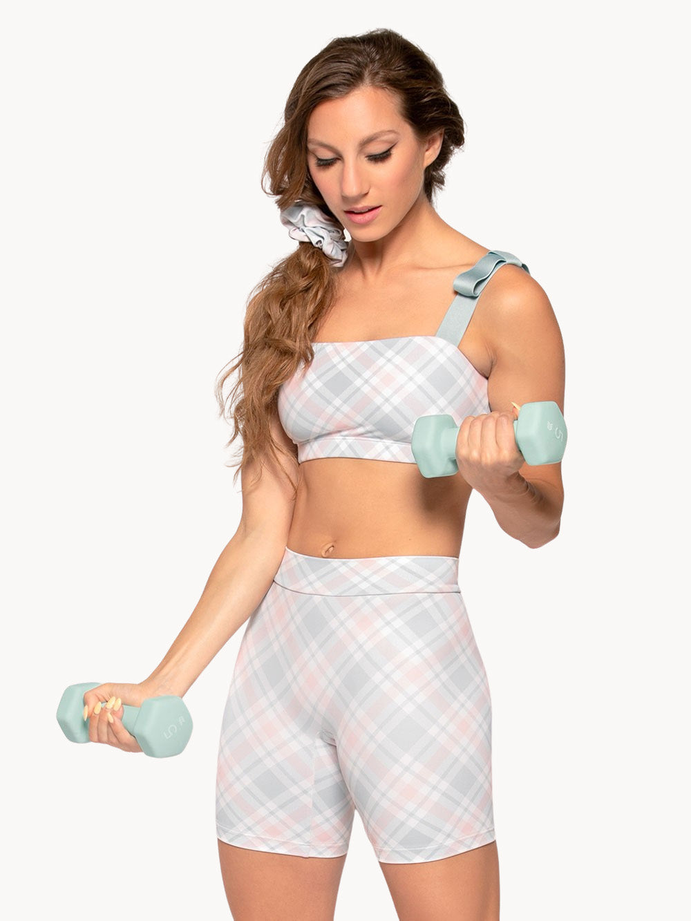 Cute misty blue and rose pink plaid all tied with a stretchy blue bow, our Carolyn Crop Top is simply sweet workout wear. Pair with our Olivia Shorts 7" Plaidness RTW to complete your fitness ensemble.