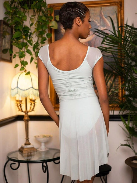 Model is wearing the Sea Glass Mesh Short Gathered Skirt RTW in size CHM.