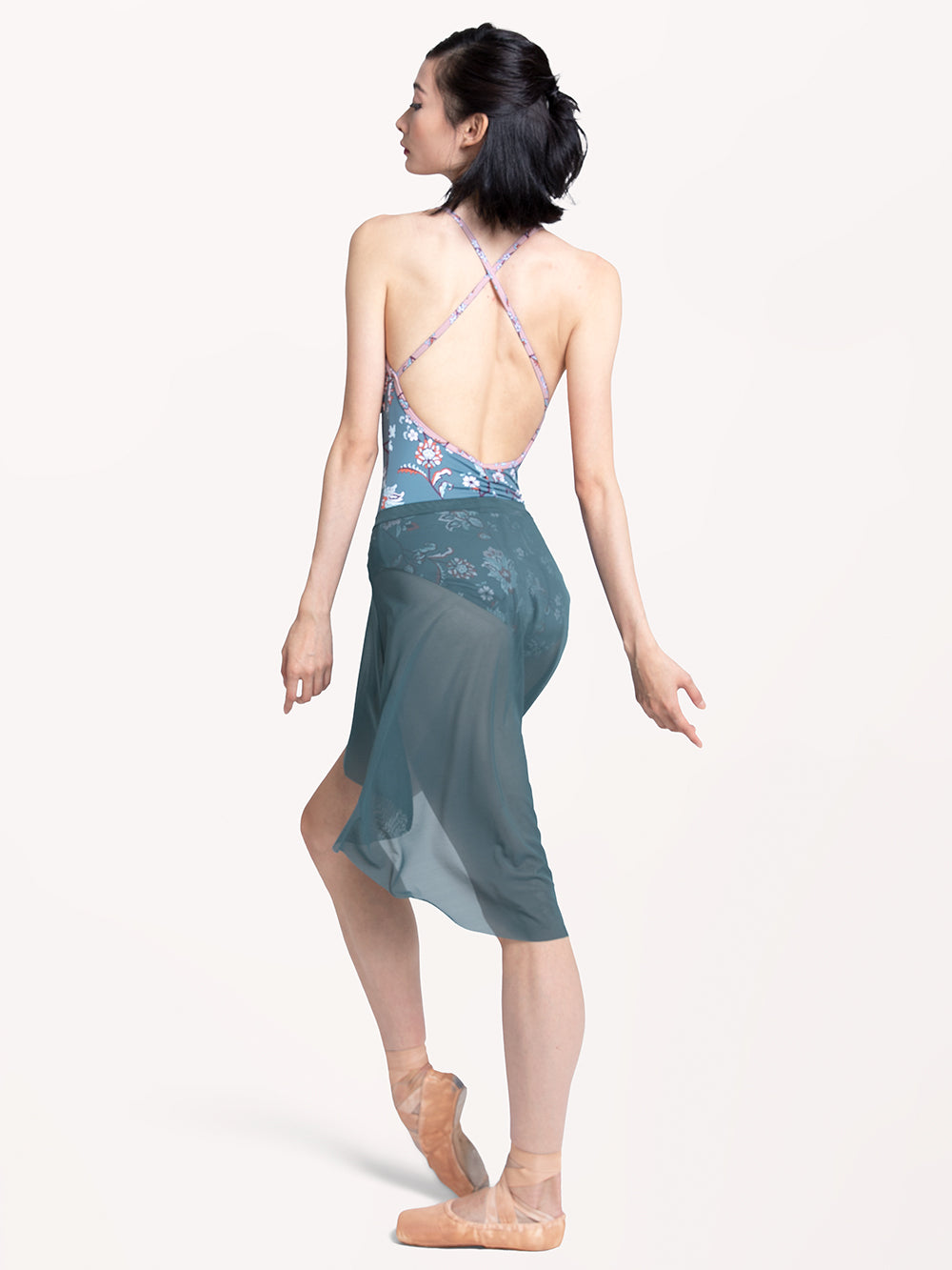 The Sonia leotard features a flattering front pinch and low pinched back with cross straps for comfort and flexibility! Try it in our Crescendo print, this lagoon color is a showstopper! We've paired it here with the Flare Skirt Kids Lagoon Mesh RTW and Dramatic High-Low Skirt Kids Lagoon Mesh RTW.