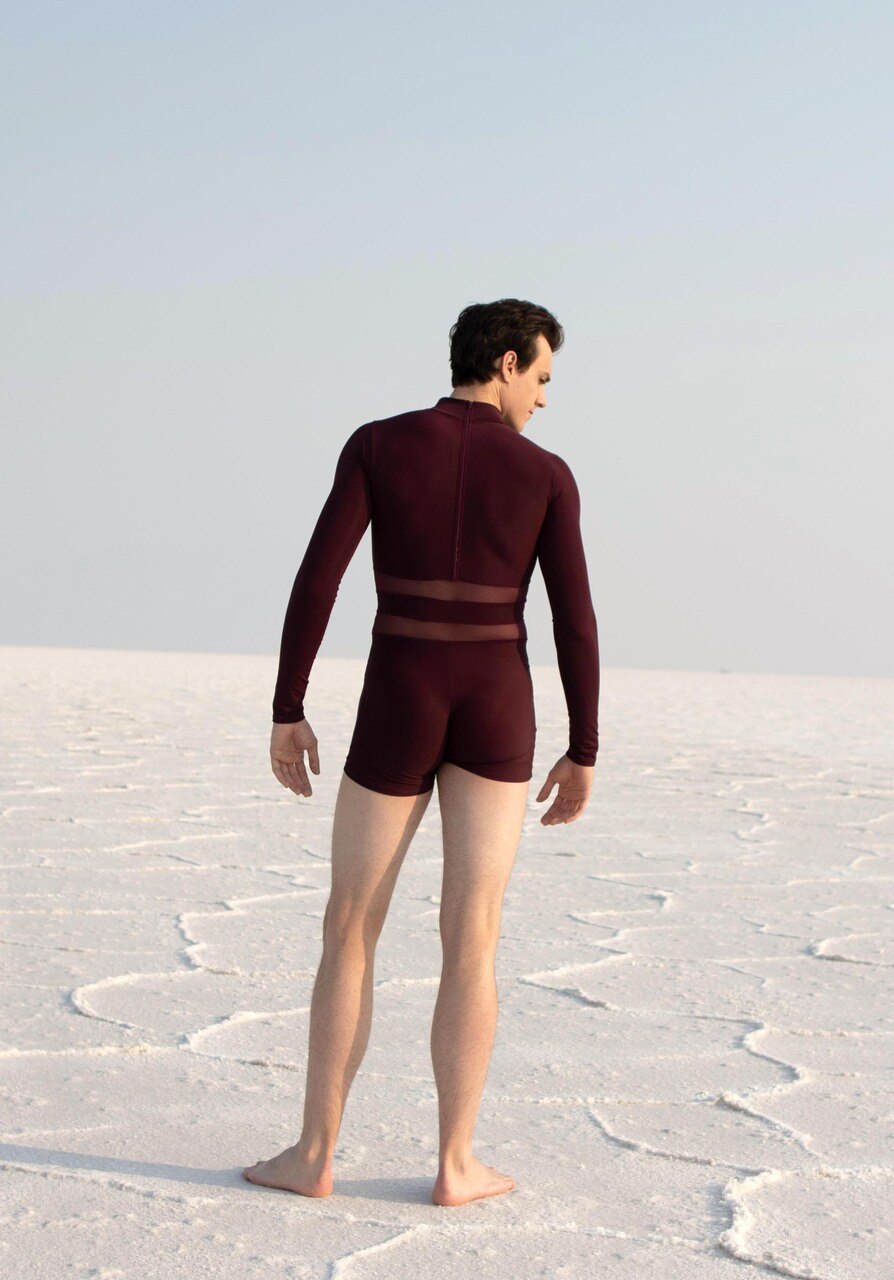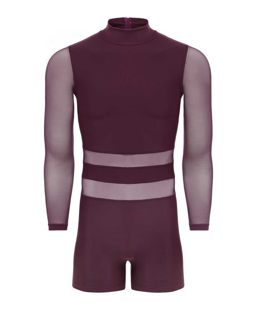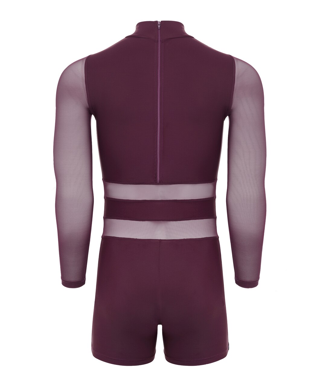 Sample is wearing Booty Length option in S-22 Sangria Matte Collar and Base with M-22 Sangria Mesh Long Sleeves and Stripes, and Matching Zipper.