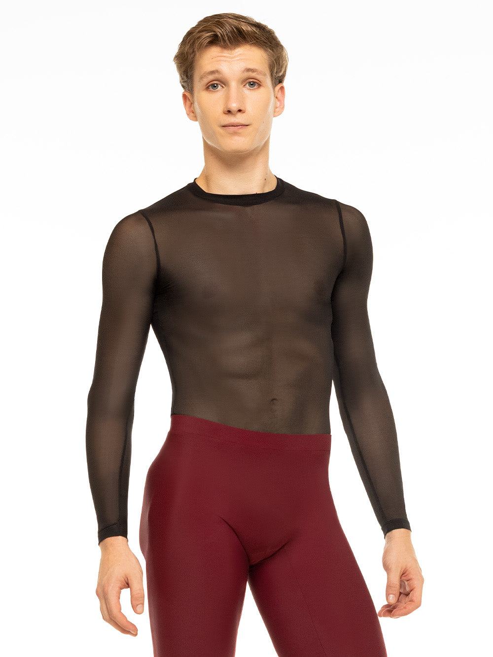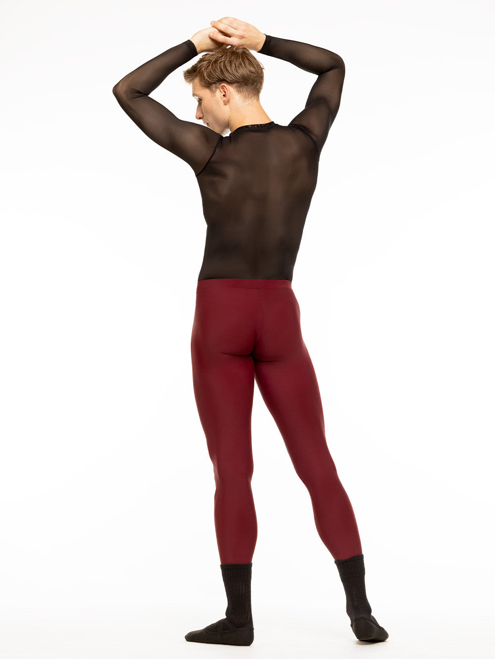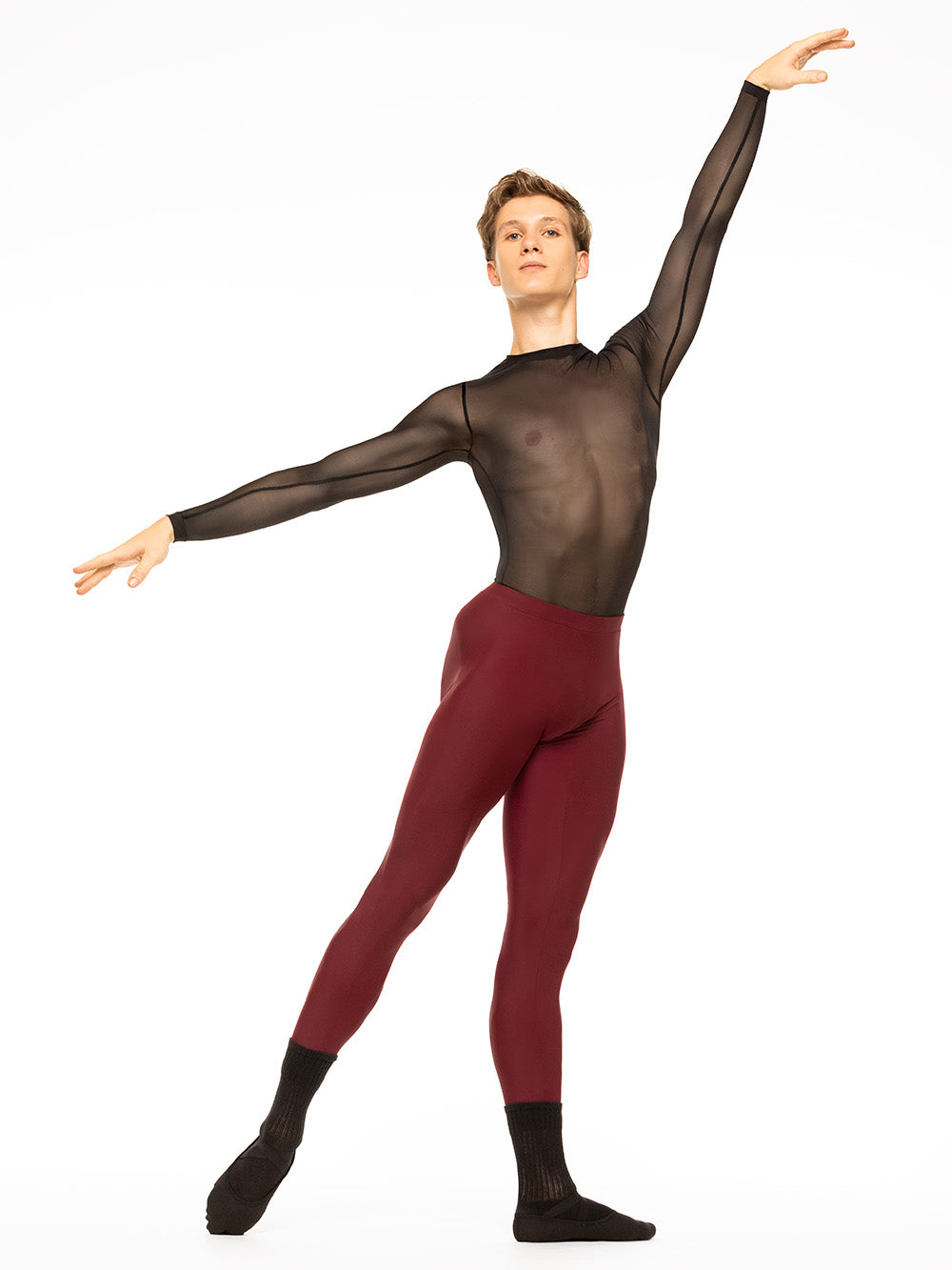 Model 2 is wearing Gabe Leotard Black Mesh RTW in size Adult Small featuring Long Sleeves and M-59 Black Mesh Base, Trim, and Sleeves, paired with Eric Tights Wine RTW.