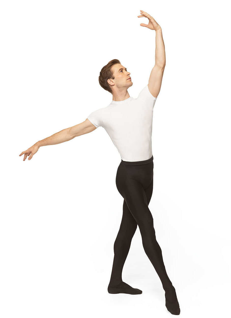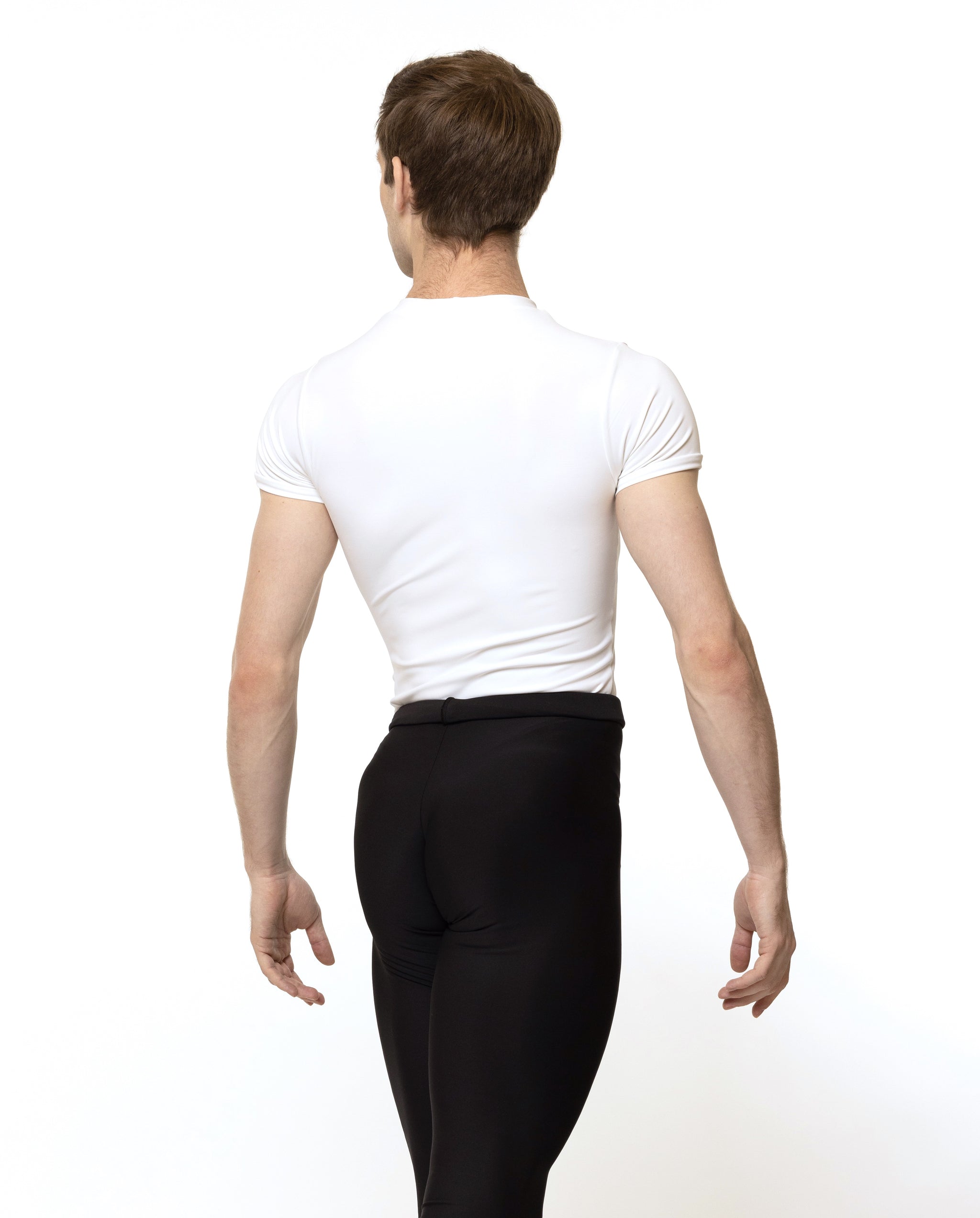 Model 3 is wearing the Gabe Leotard in size Adult Small featuring Short Sleeves and SOFT-1.5 Stage White Base, Trim, and Sleeves, paired with the Ryan Tights Black RTW.