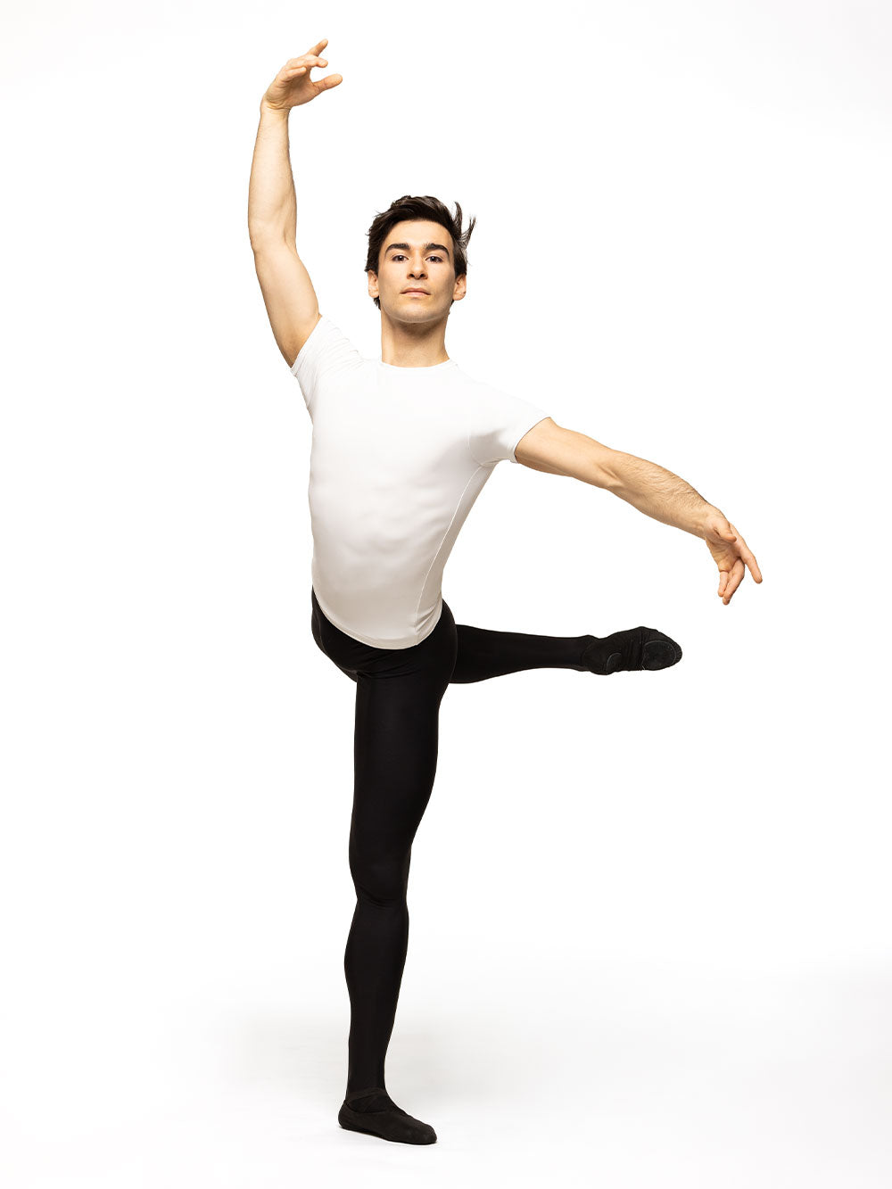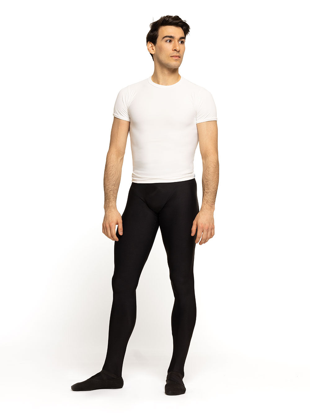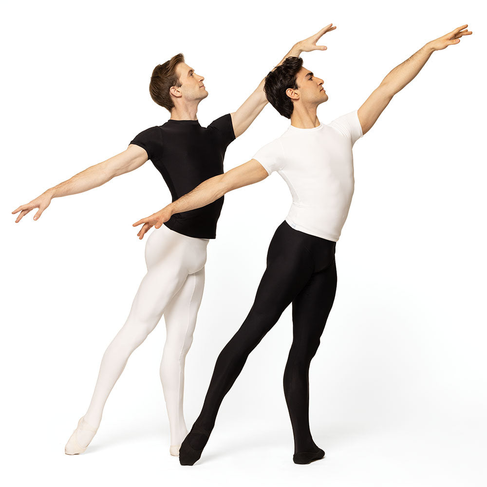 Model 1 is wearing Ryan Tights Black RTW in size Adult Small with Gabe Shirt Stage White RTW.
