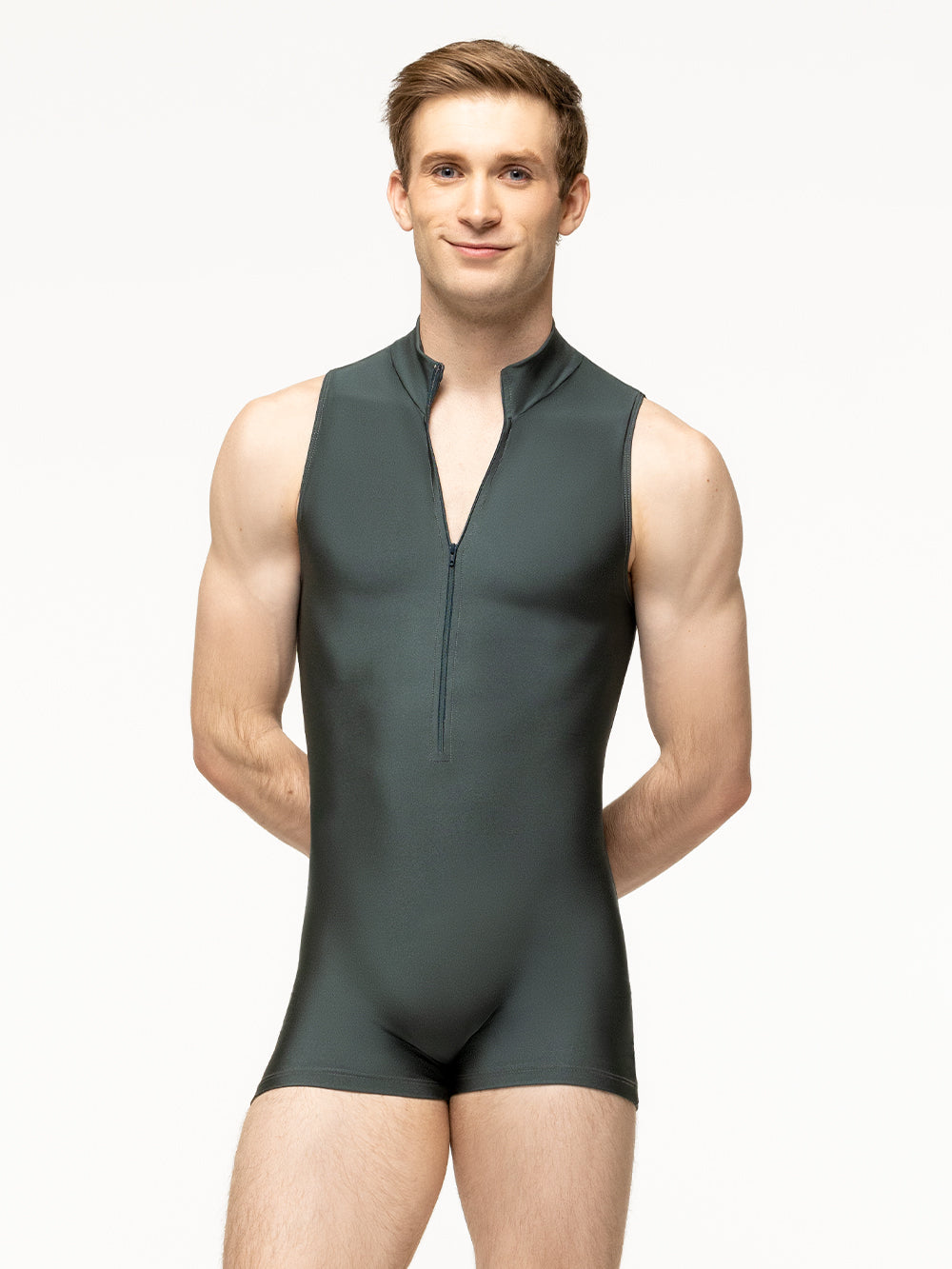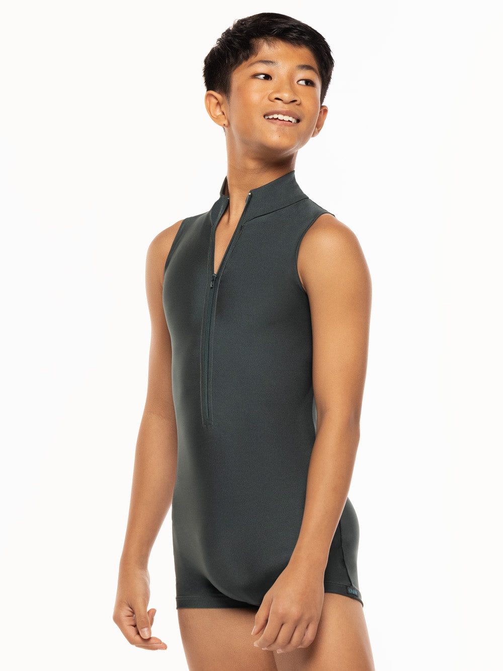 Everyone loves zip-front biketard, especially ours! The Logan Biketard features our shiny Dark Forest fabric, a sleeveless design, and a short booty length.