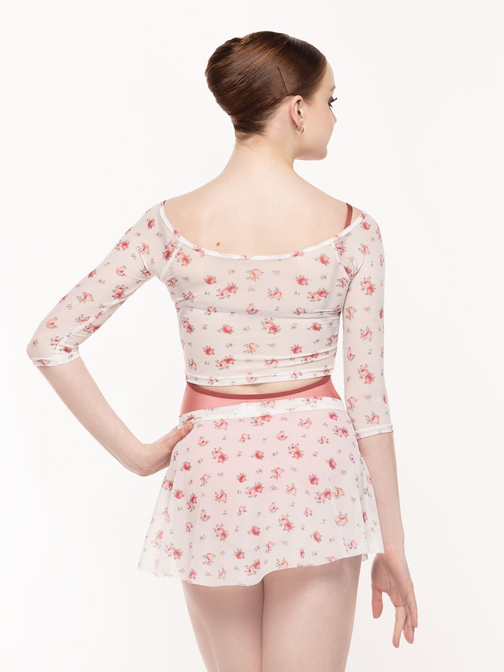 Model is wearing leotard, skirt, and crop top in adult size XS.