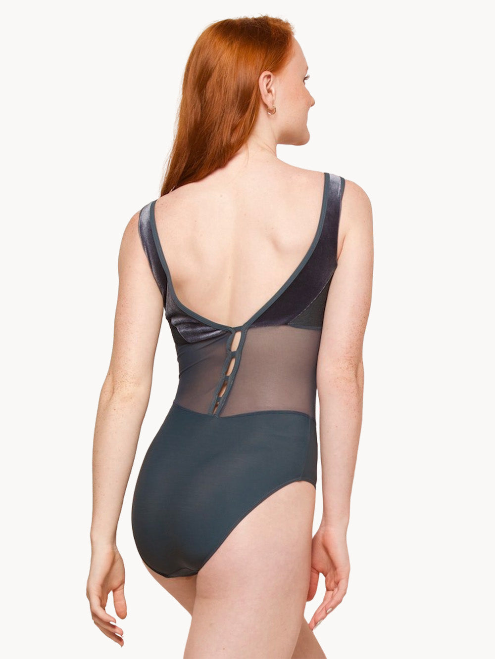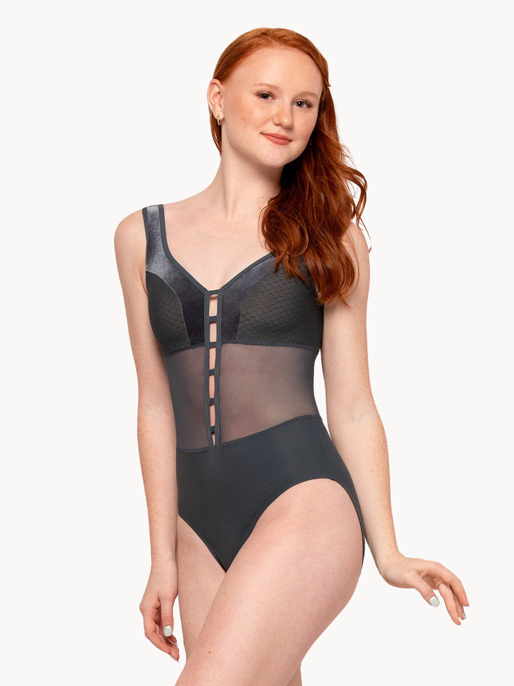 Create an elegant look with a hint of mystery in our Symphony Matte! This Sholeh gives you a touch of flair featuring a Symphony Mesh waist, matte base, and Storm velvet detail around the neckline, as well as a Symphony Diamond Mesh Overlay for the Front Panels for even more added interest! The front and back feature laddered elements completing to a low V in the back. Finish the ensemble with the matching Short High-Low Skirt Symphony Diamond Mesh RTW!