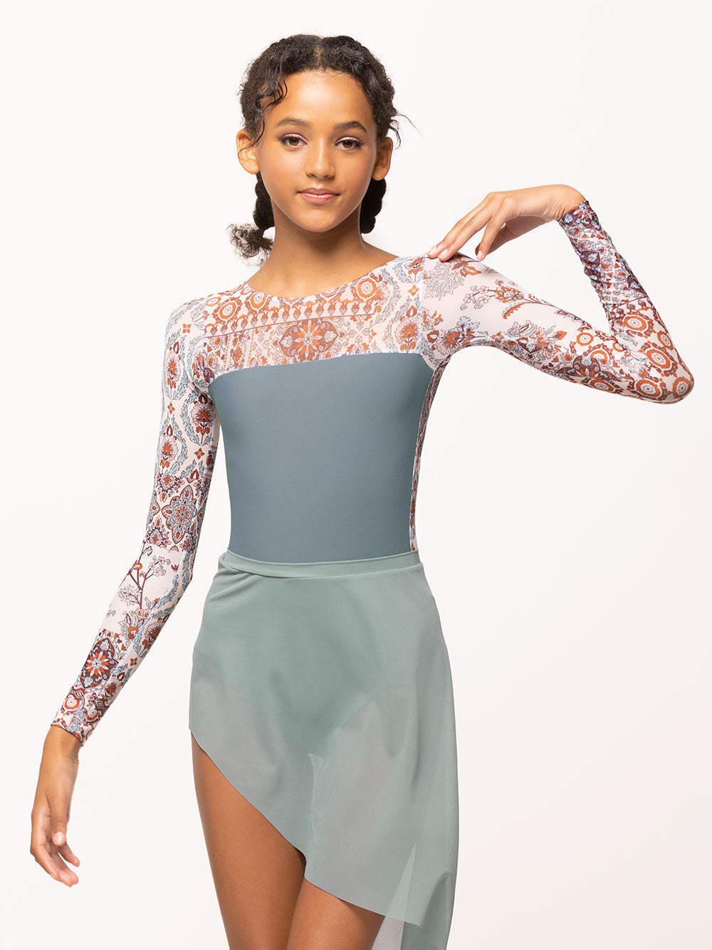 The beauty of our new Patchwork Mesh is abundant on the Tri, featuring to the wrist sleeves and a full back panel. The Blue Agave base perfectly compliments the print. We paired it here with the Asymmetrical Short Skirt Kids Moonstone Mesh RTW. Print placement will vary.
