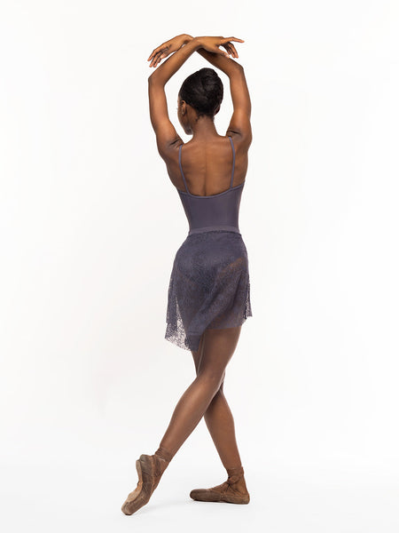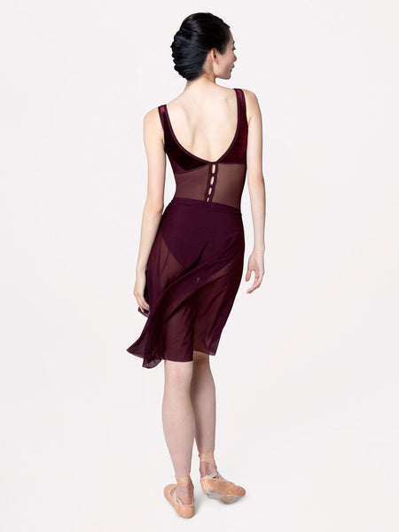 Model is wearing the Louise Sugar Plum RTW leotard with the Mid High-Low Skirt Plum Lace RTW, Short Gathered Skirt Sangria Mesh RTW, and Peacock Skirt Plum Mesh RTW with matching Sugar Plum Barrier Mask RTW, sold separately.