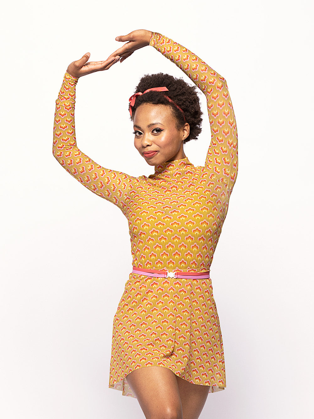 Our classic Short High-Low Skirt is the perfect addition to any look. This new, fun pattern Peace & Love Mustard Mesh is sure to impress, both on stage and in class! We've paired here with the Naomi Dijon RTW and Ashley Top Peace and Love Mesh RTW.