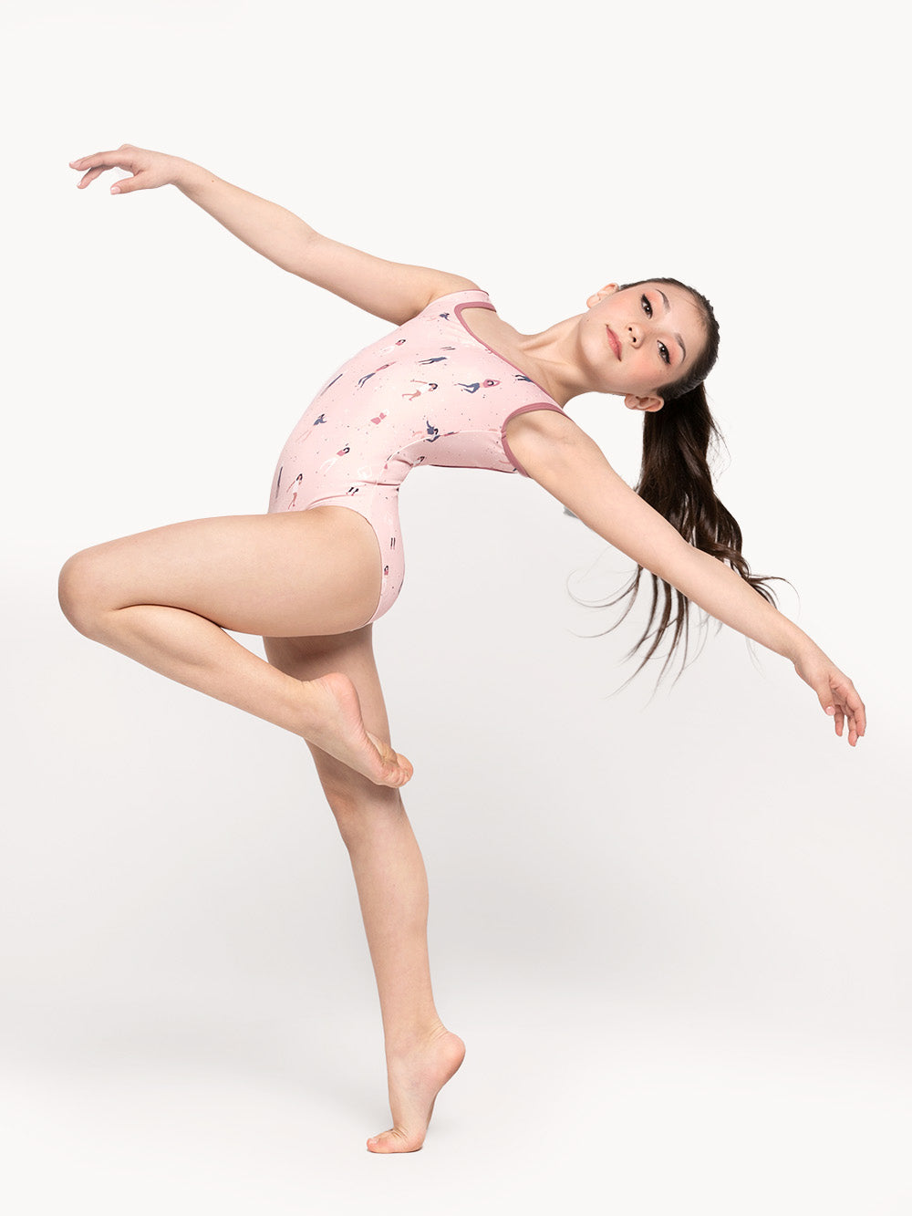 Sport our cute-as-can-be Leah Leotard in Dance Party. The flattering style features a fun dancer-themed print with Dark Quartz trim for a pop of contrast!