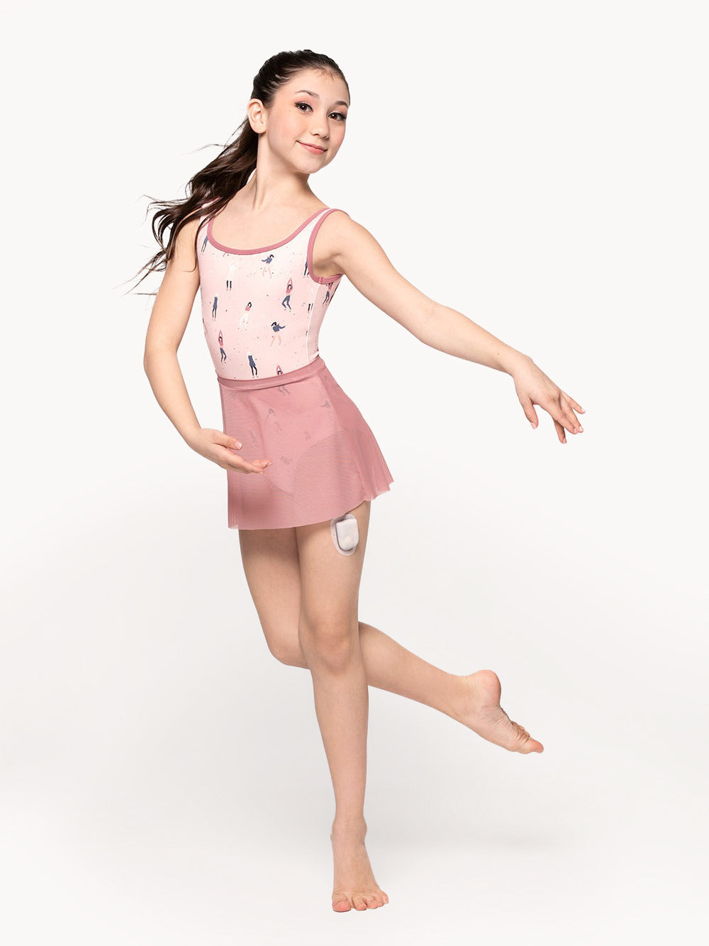 Model is wearing Leah Kids Dance Party RTW with A-Line Skirt Kids Quartz Mesh RTW in size CHM.