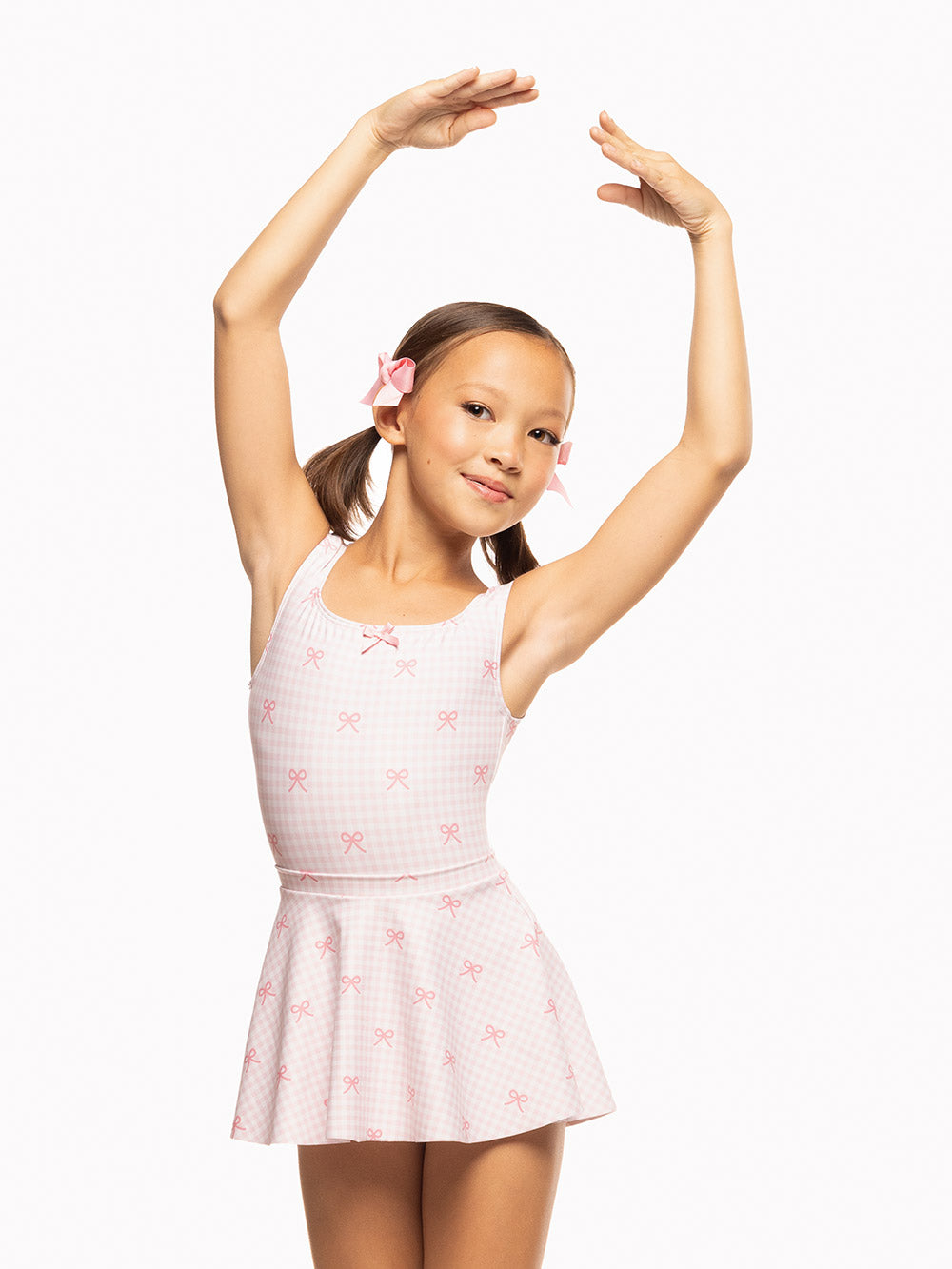 Be Pretty in Pink and full of charm in our adorable new Lina leotard. Featuring wide supportive straps, a square neckline, and the sweetest gingham and bows print. Pair it with our matching Flare Skirt Tiny Bows Kids RTW for the perfect look.