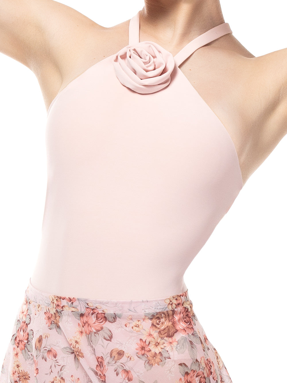 Model 1 is wearing Rosette Leotard Powder Pink RTW with Flare Skirt Love Letter Mesh RTW in size Adult Small.