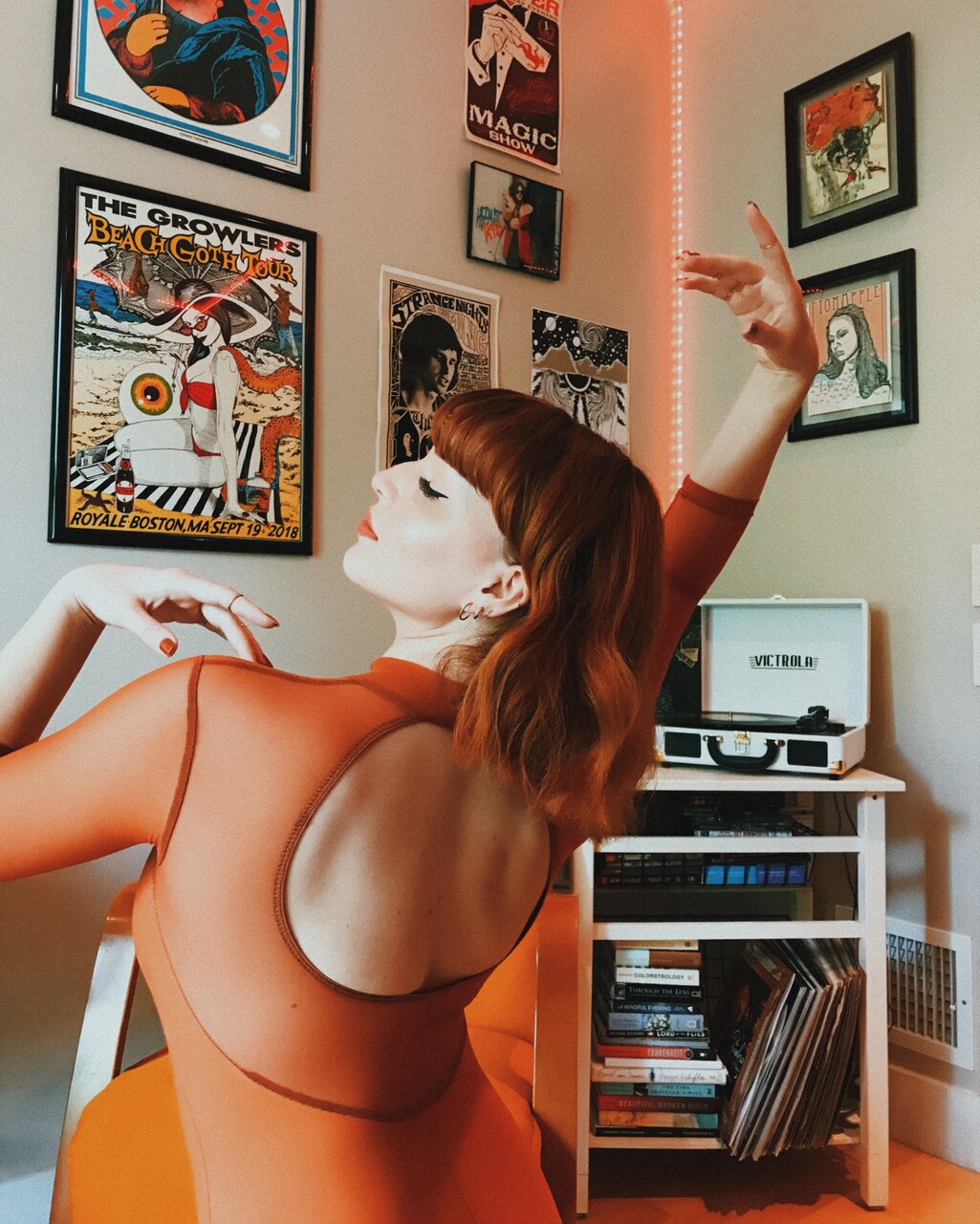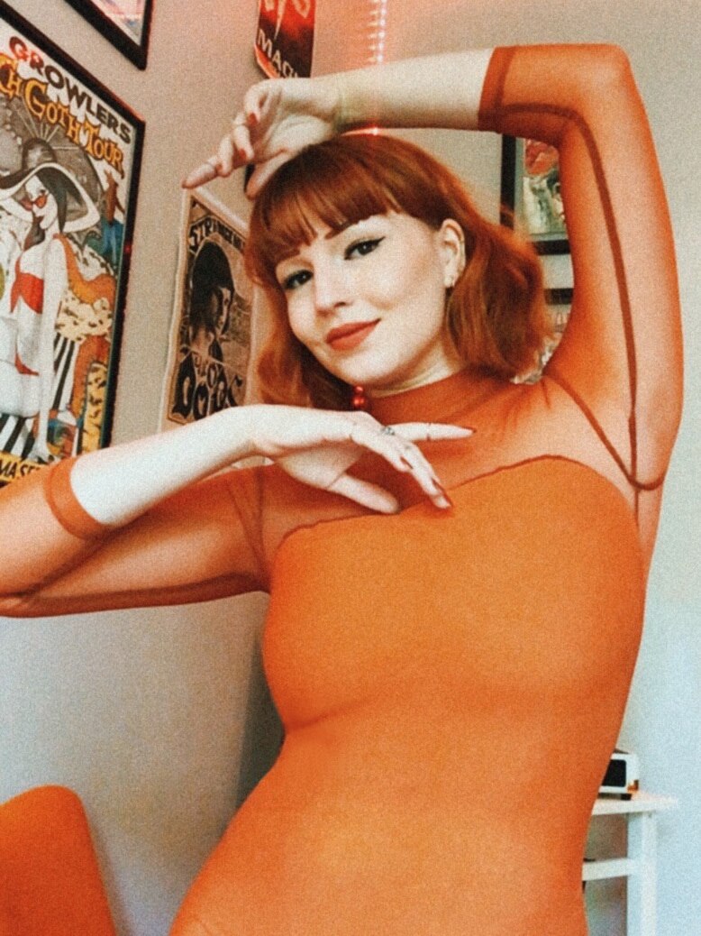 Model is wearing a size Large in S-54 Copper Matte Base with M-54 Copper Mesh Top, Collar, and Below Elbow Sleeves.
