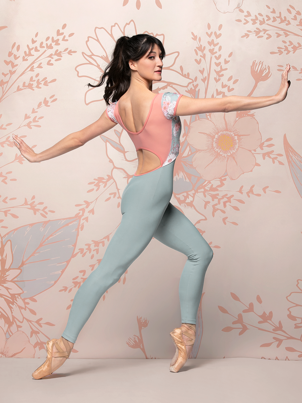 - Model 1 is wearing Natasha Unitard Devoted Seascape RTW in size Small featuring RTW exclusive Devoted Seascape print Top Front, M-7.8 Sunset Mesh Top Back, S-33.6 Misty Blue Matte Base, and S-7.8 Sunset Matte Trim.