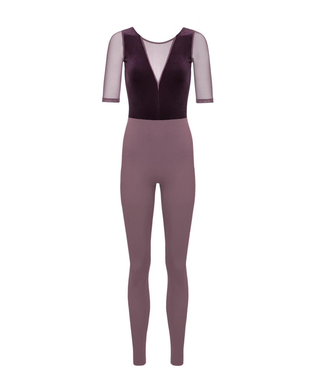 Sample is Unitard Cut made with S-26 Mauve Matte Base and VEL-26 Mauve Velvet Top Front and Back with M-26 Mauve Mesh V Panels and Above Elbow Sleeves.