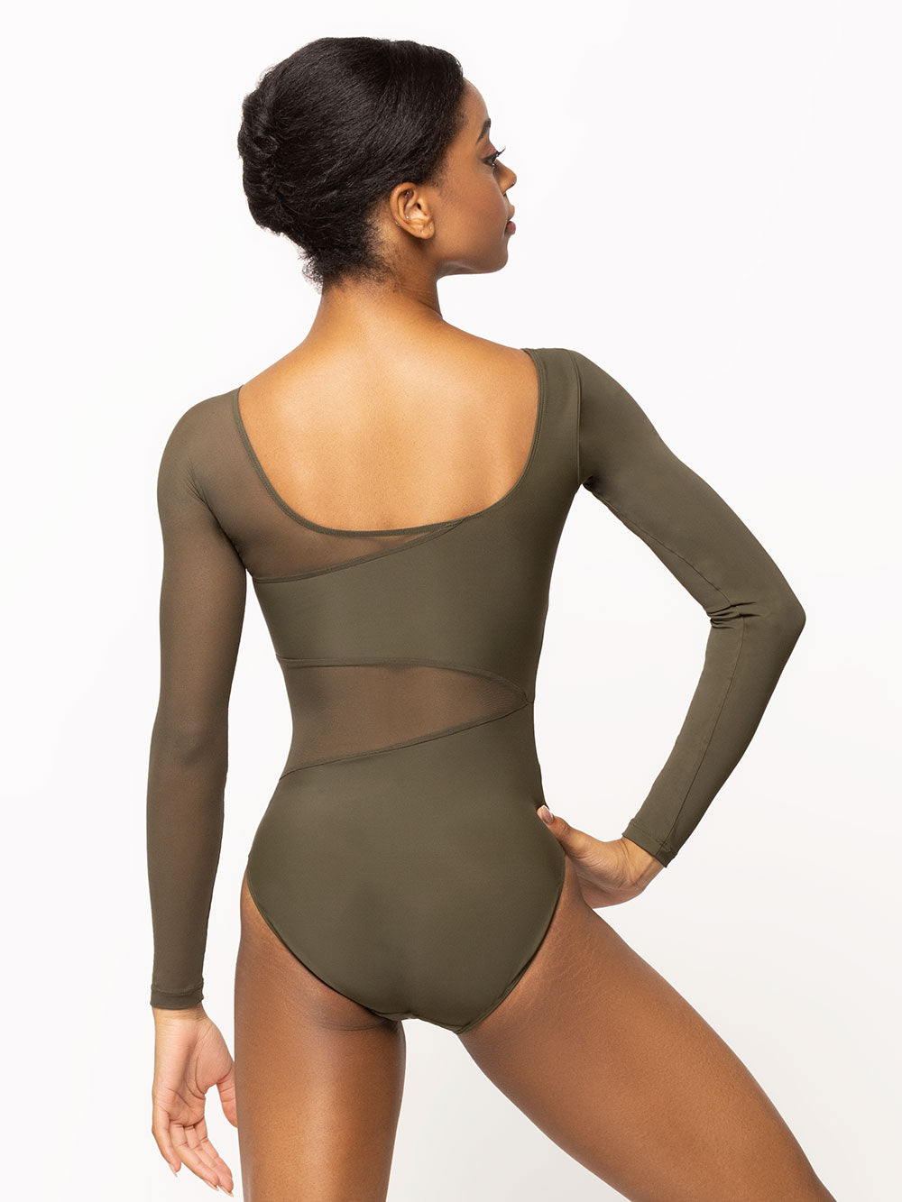 Model 2 is wearing Amelie Dark Olive RTW featuring S-50.5 Dark Olive Matte Base and Right Sleeve and M-50.5 Dark Olive Mesh Left Sleeve and Middle with To the Wrist Sleeves.