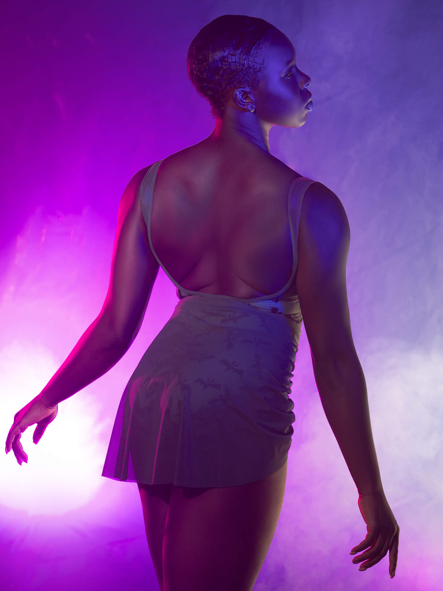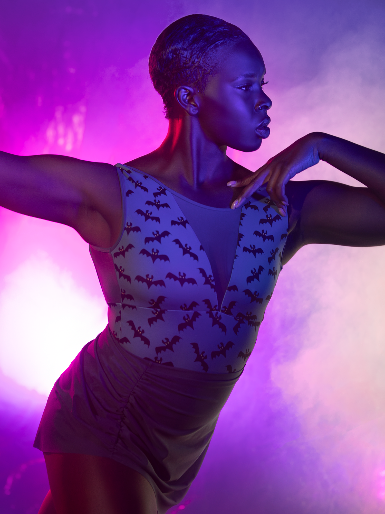 - Model 1 is wearing Brooke Tank Bats RTW featuring P-529 Bats Base and Top Front, S-40.8 Symphony Matte Trim, and M-40.8 Symphony Mesh Front V and Back Panels, paired with the Short Gathered Skirt Symphony Mesh RTW.
