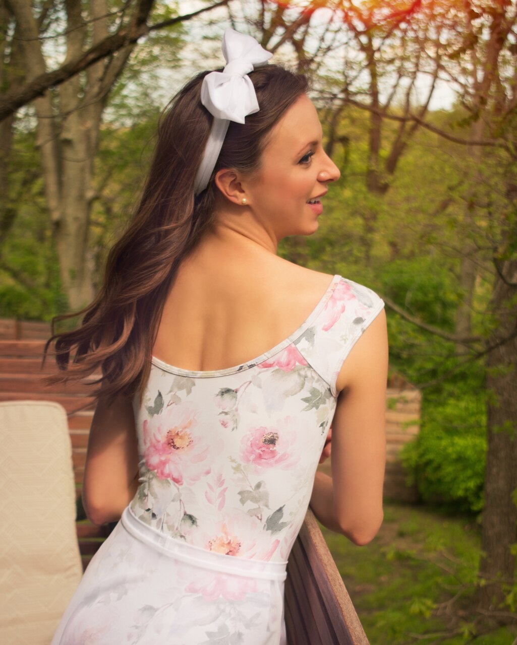 Model 4 is wearing Tea Time Base, Trim, and Straps and Tulip Skirt White Mesh RTW in Adult size S.