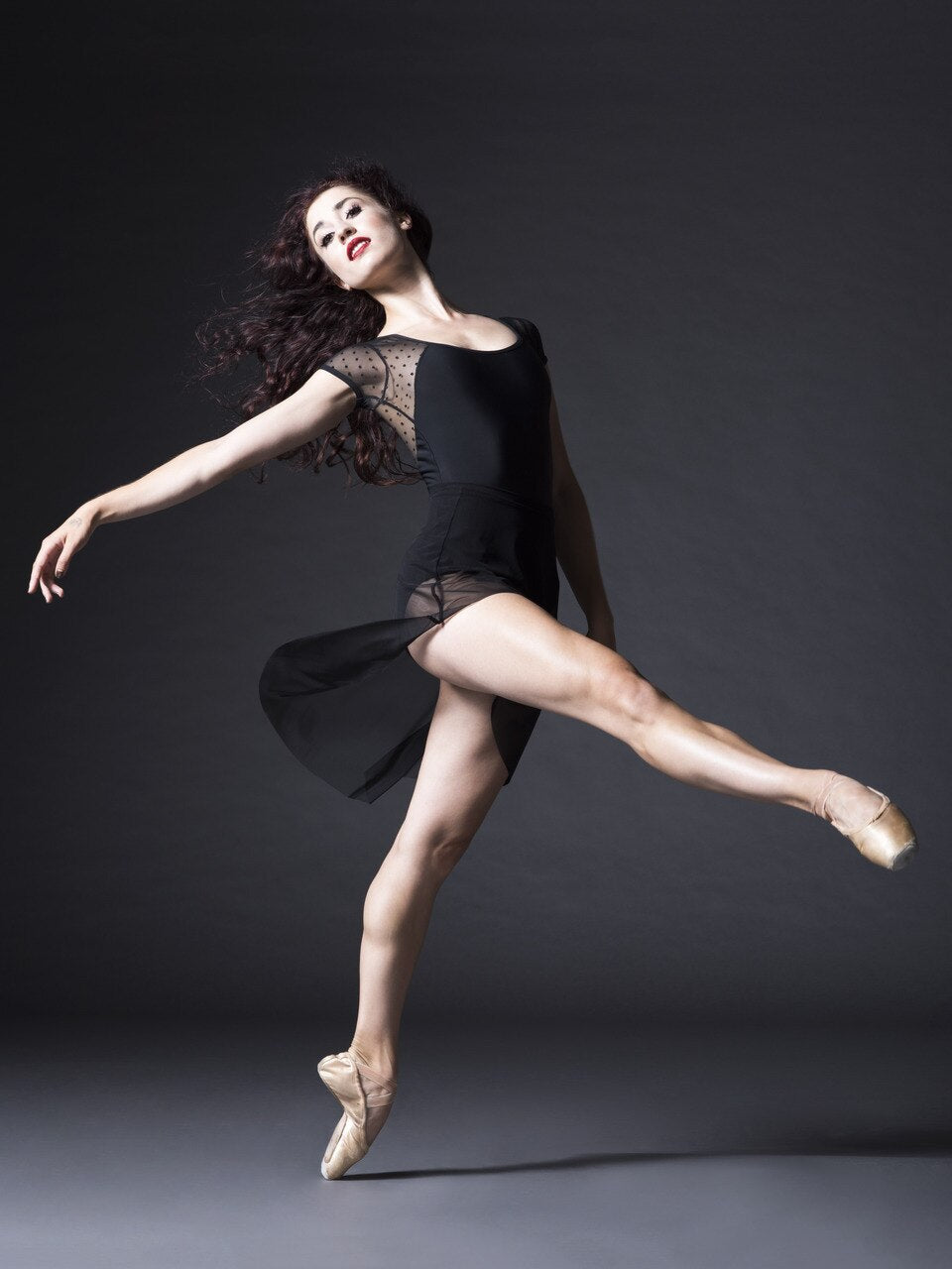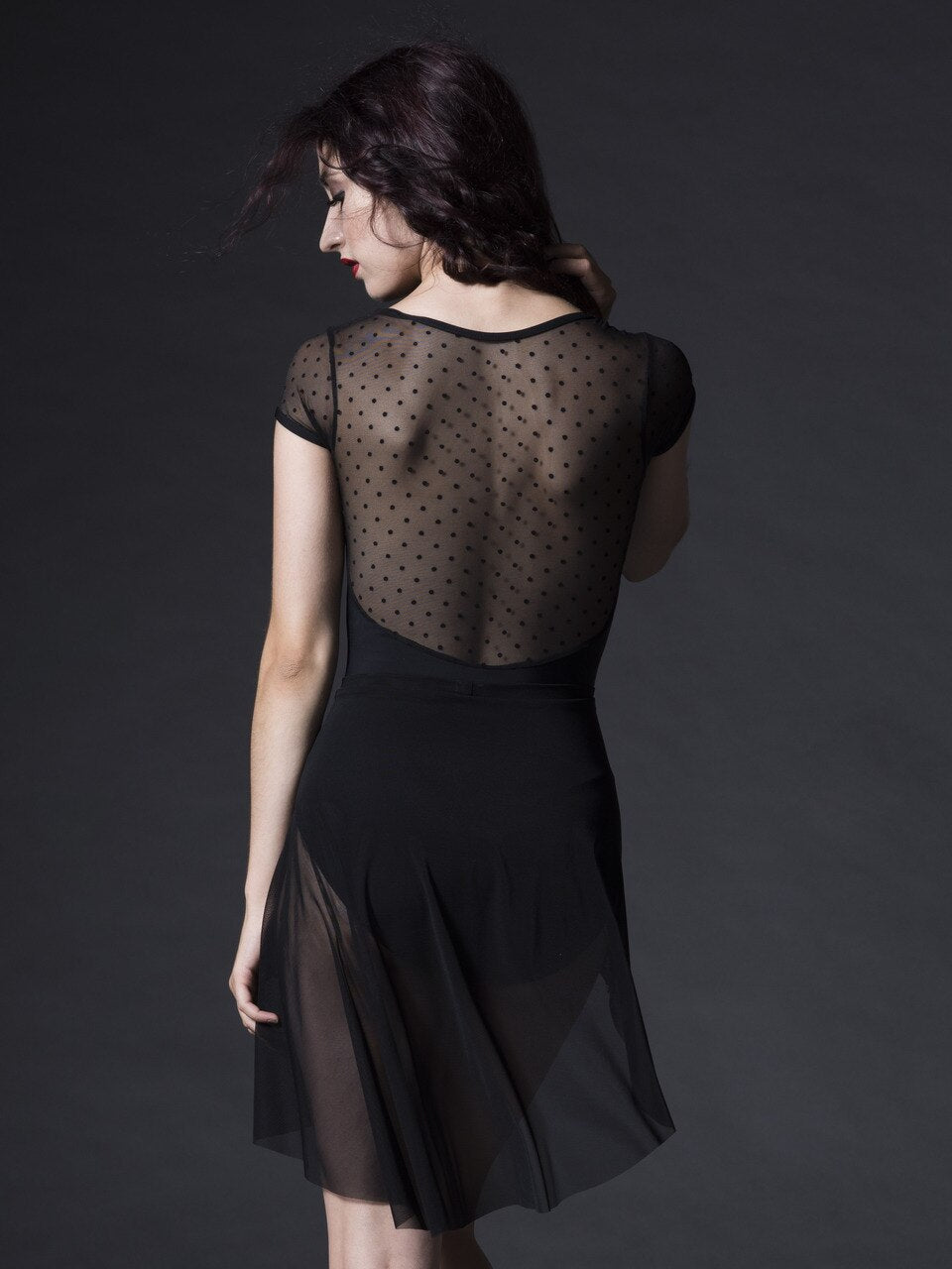 - Model 2 is wearing S-59 Black Matte Base and Trim with PM-159 Black Dot Mesh Top Front and Back and Barely Over Sleeves, paired with the Asymmetrical Short Skirt Black Mesh RTW.