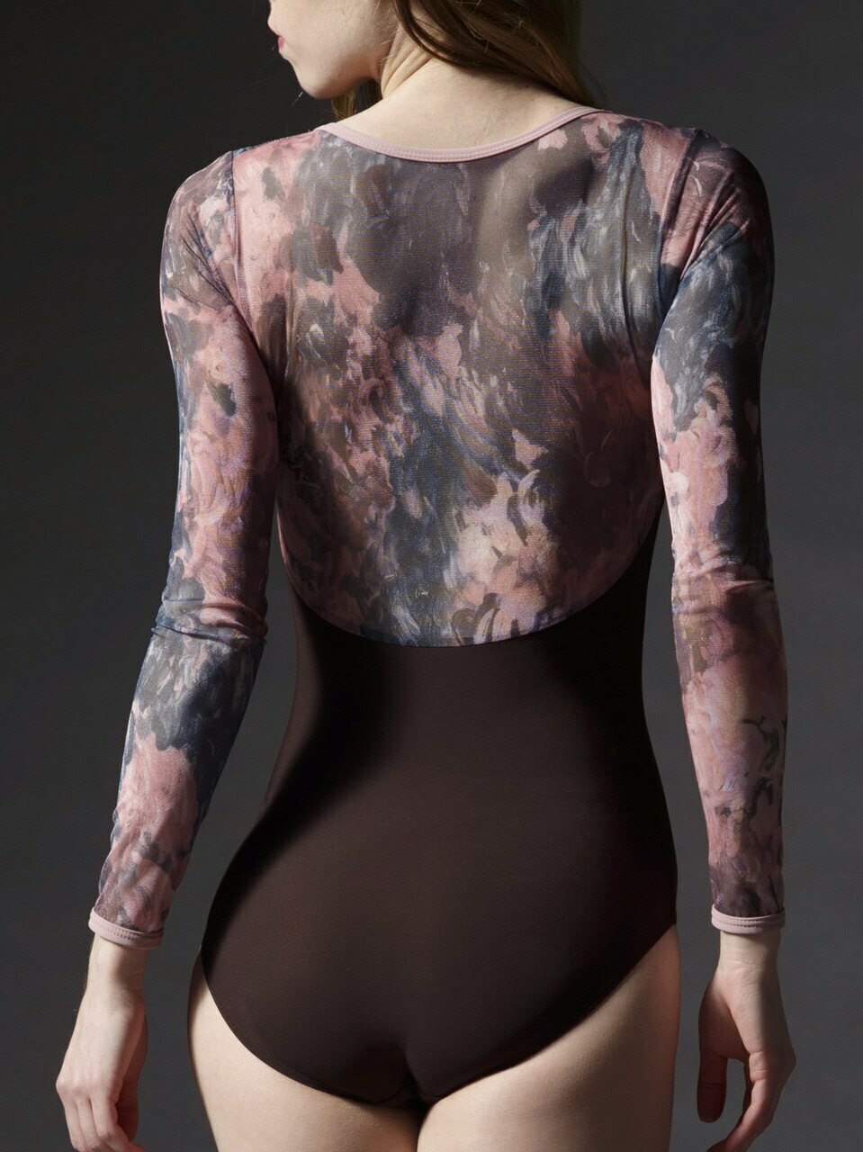 - Model 1 is wearing S-53 Dark Brown Matte Base with PM-143 Fingerpaint Mesh Top Front and Back and To The Wrist Sleeves with S-8 Dusty Rose Matte Trim.
