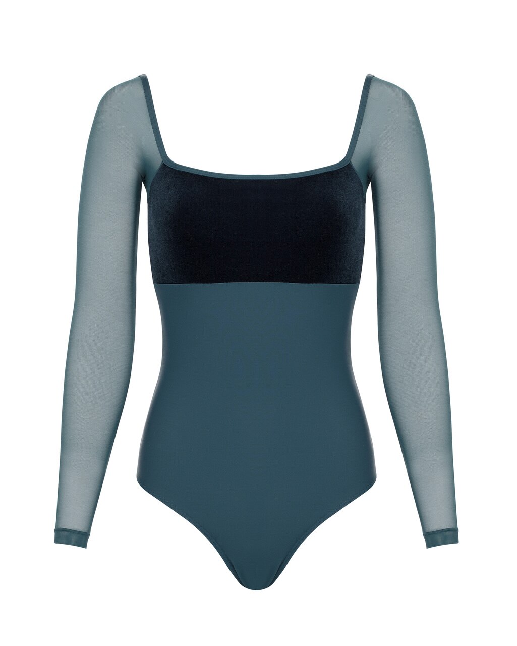 Sample is made with S-40.6 Lagoon Matte Base and Trim with VEL-40.6 Lagoon Velvet Top Front and Back with M-40.6 Lagoon Mesh To The Wrist Sleeves.