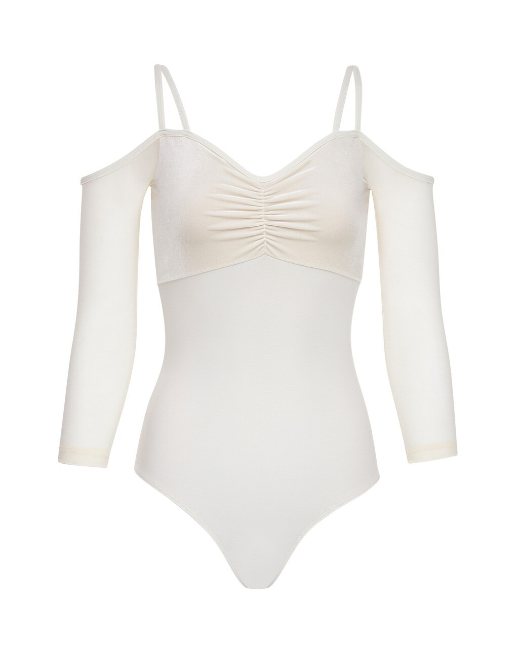 Sample is wearing the Double Strap option with S-2 Ivory Matte Base and Trim, VEL-2 Ivory Velvet Top Front and Back, with M-2 Ivory Mesh Below Elbow Sleeves.