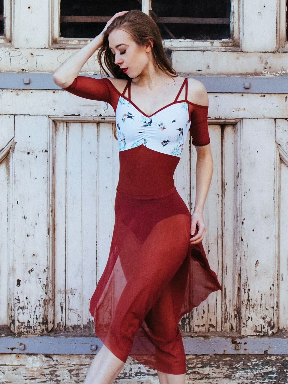 Model 3 is wearing the Double Strap option featuring S-57 Med Gray Base and Top Front Underlay, M-9 Light Pink Matte Trim, and PM-159 Nightingale Mesh Top Front Overlay, Back Panel, and to the Wrist Sleeves paired with our Flare Skirt in S-57 Med Gray.