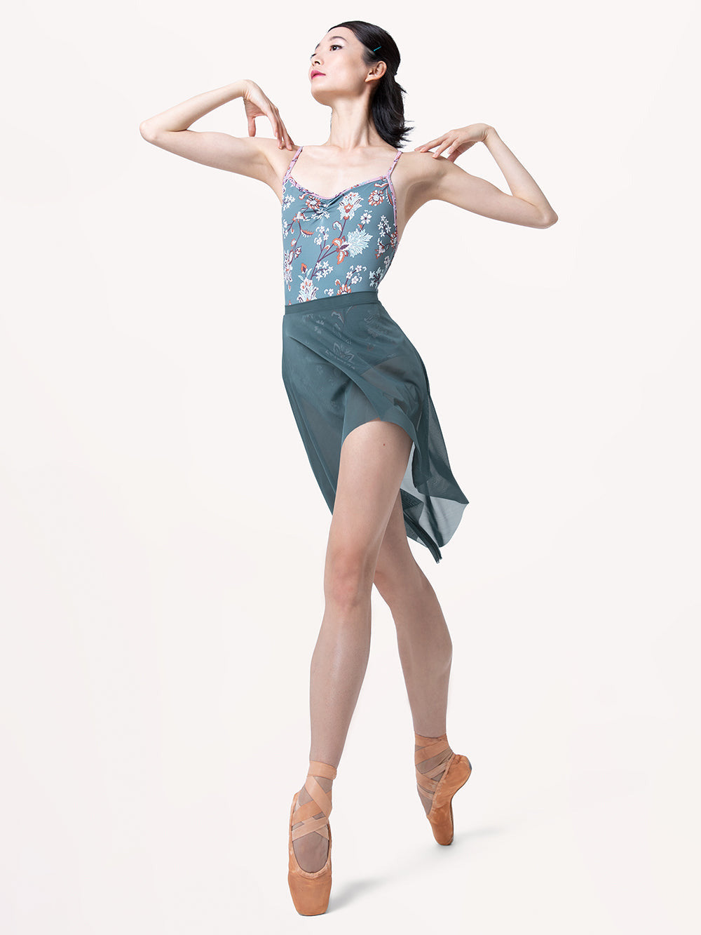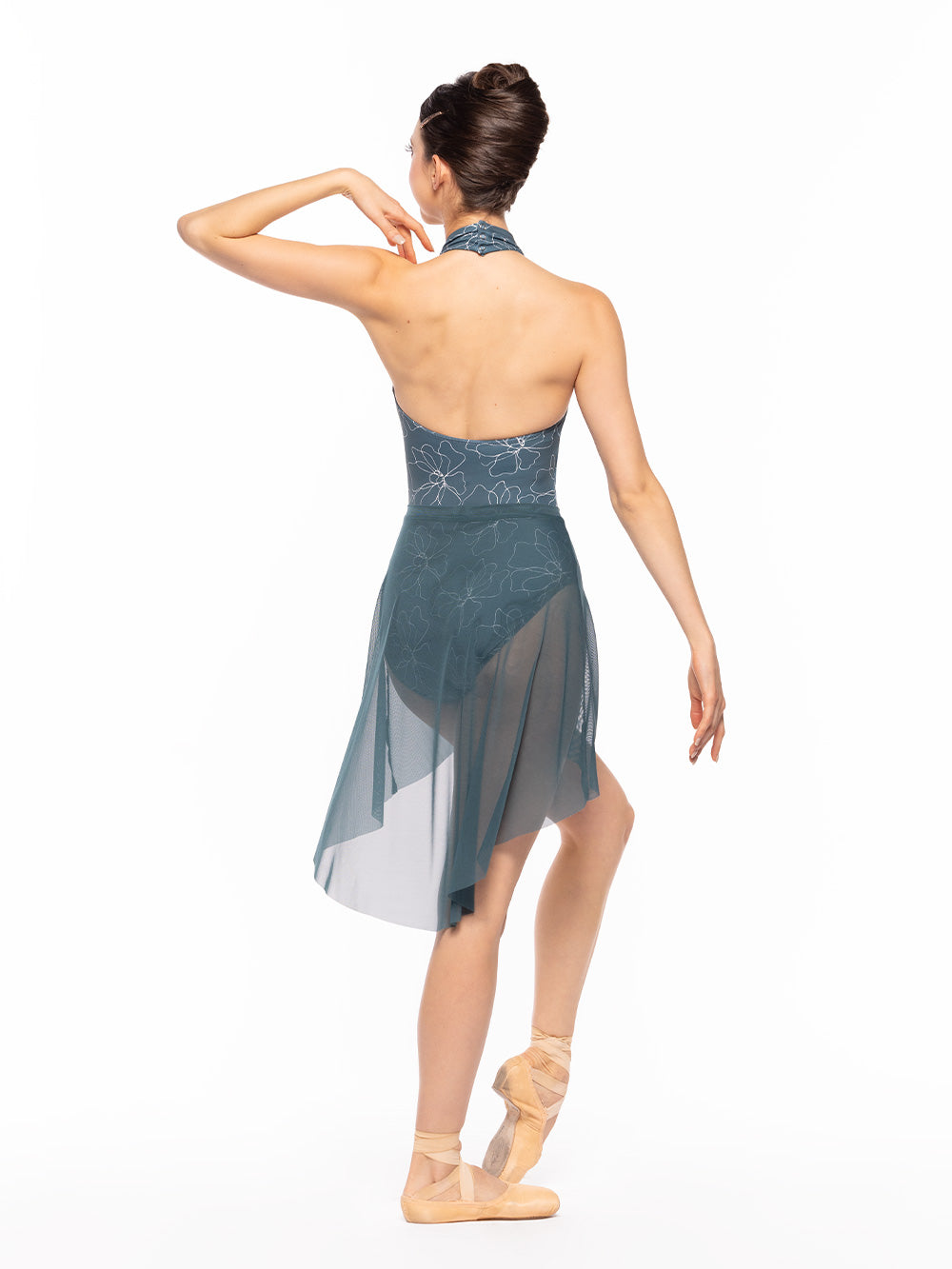 Add some drama to your dance bag. The Dramatic High Low Skirt in our best-selling Lagoon Mesh is the perfect style to wear on stage or in studio. Pairs with many of our styles, you won't be able to just pick one! Pictured with our Mona Leotard Distant Memory RTW and Sonia Leotard Crescendo Lagoon RTW.