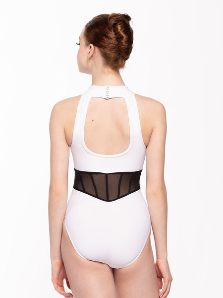 Model 3 is wearing the Black Mesh Tulip Skirt with a Hannah Leotard.