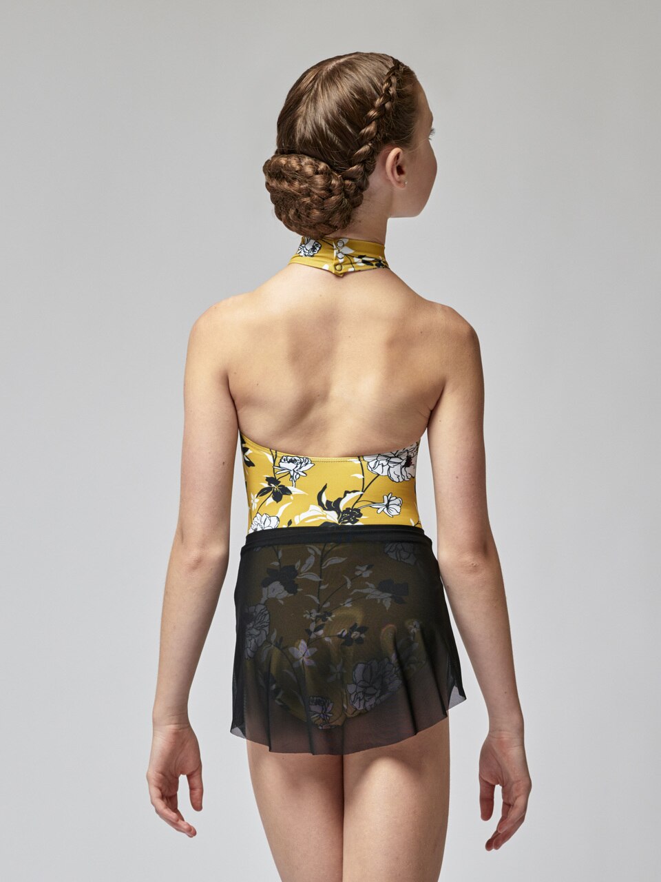Model 2 is wearing the Black Mesh Tulip Skirt with a Poppy Low Back Leotard.