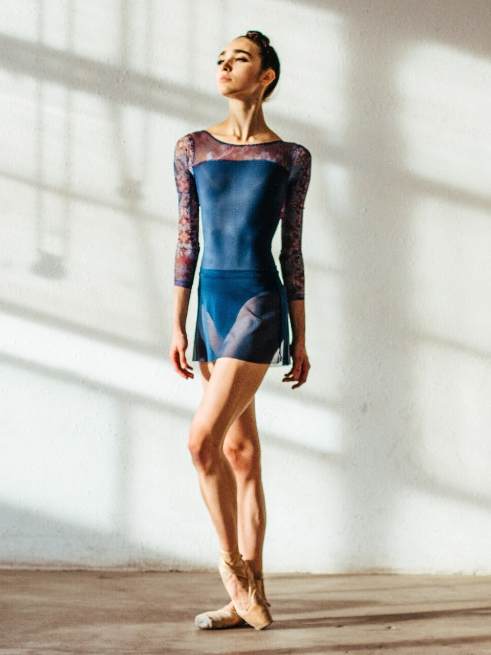 Model 1 and 3 are wearing A-Line Skirt Midnight Mesh RTW in size Adult X-Small with Tri Leotard Tapestry RTW (discontinued) featuring S-31.5 Midnight Matte Base and Tapestry Mesh Top and Sleeves.