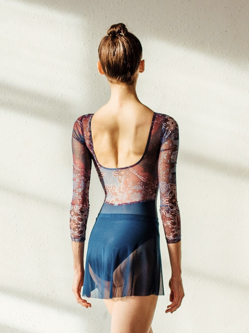 Complement your Custom leo with our classic A-line silhouette skirt made in our Midnight Mesh.