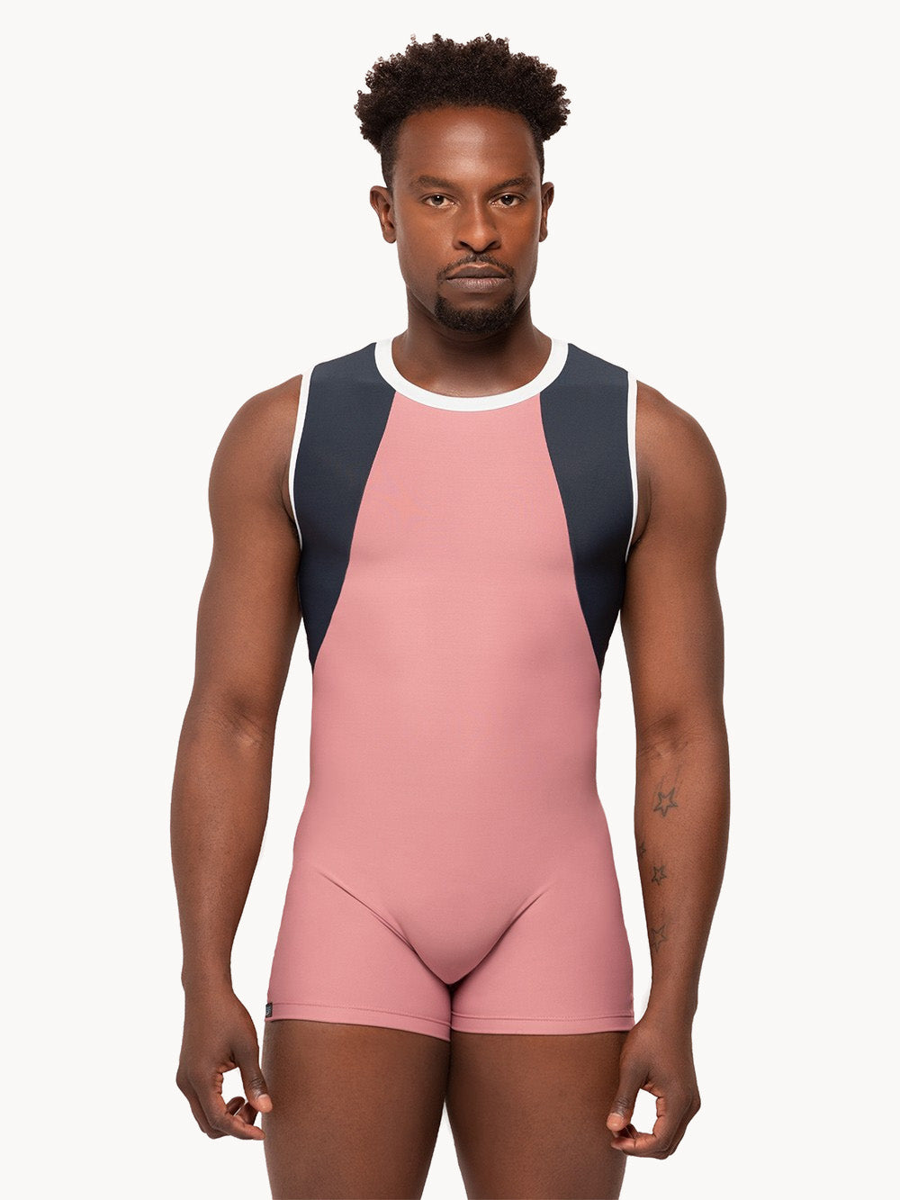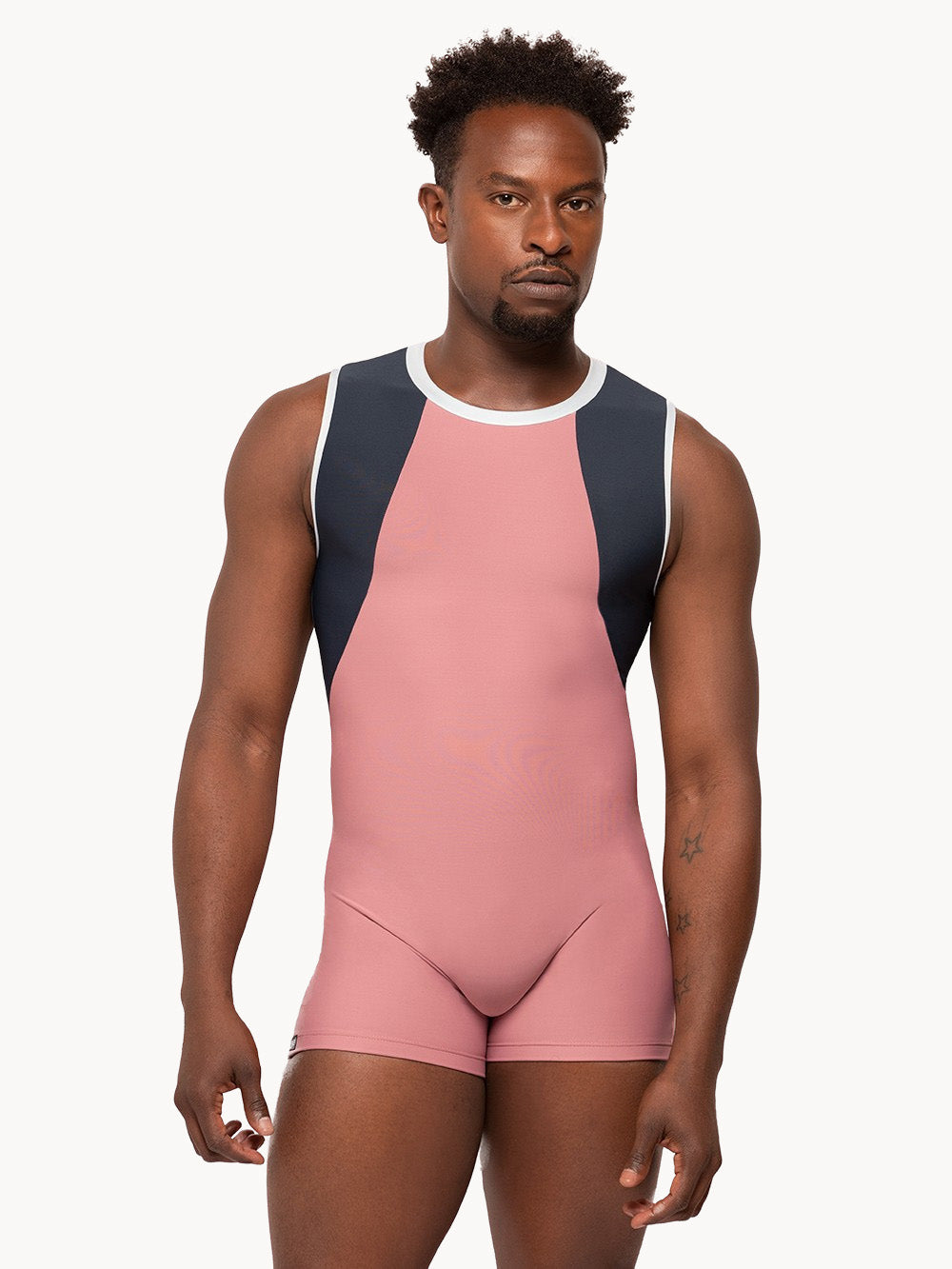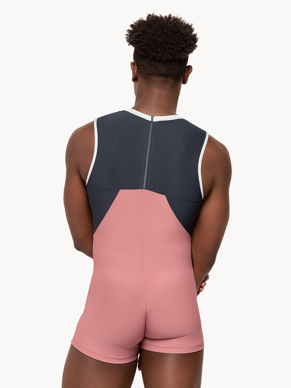 Our Adam Biketard is made with a soft Dark Quartz base and features Dark Storm side and back panels with white trim.